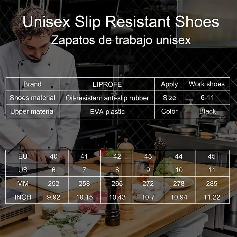 Upper Material: Eva Lining Material: No Lining Sole Material: Rubber Insole Material: Eva Closing Method: Slip-on Toe Holder: round Head Scene: Daily and Casual, Casual Pattern: Solid Color Applicable People: General High Top Height: Low Top These black work clogs are suitable for both men and women, perfect for those who stand for long periods, need excellent slip resistance, and appreciate a convenient slip-on design The specially designed outsole uses patented technology to prevent slipping, allowing you to focus on your tasks without worrying about smooth surfaces. The outsole is slip-resistant, waterproof, and oil-proof These shoes are both comfortable and quiet, with great flexibility, easy cleaning, and convenient slip-on functionality, making them perfect for long hours of work. Additionally, they are designed to minimize noise while walking. If your size is between two options, please order one size larger