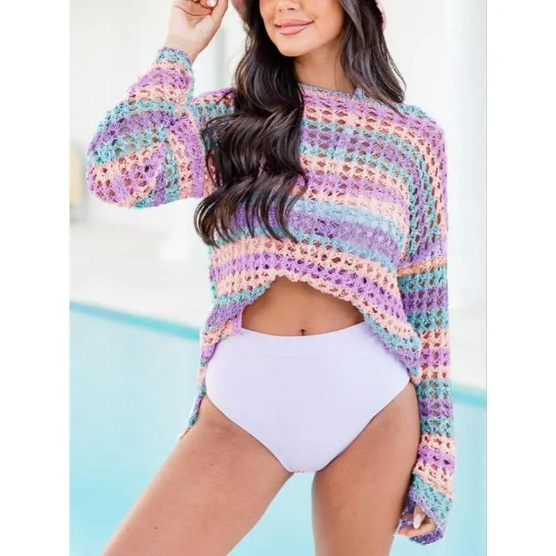 Women's Colorblock Striped Print Sweater, Casual Long Sleeve Round Neck Jumper for Daily Wear, Ladies Knitwear for All Seasons