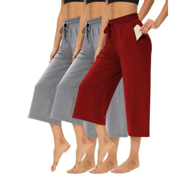 3pcs Drawstring Wide Leg Capri Pants, Women's Loose Fit Athletic Yoga Pants With Pockets, Casual Comfort Sports Cropped Trousers For Outdoor Fitness Training