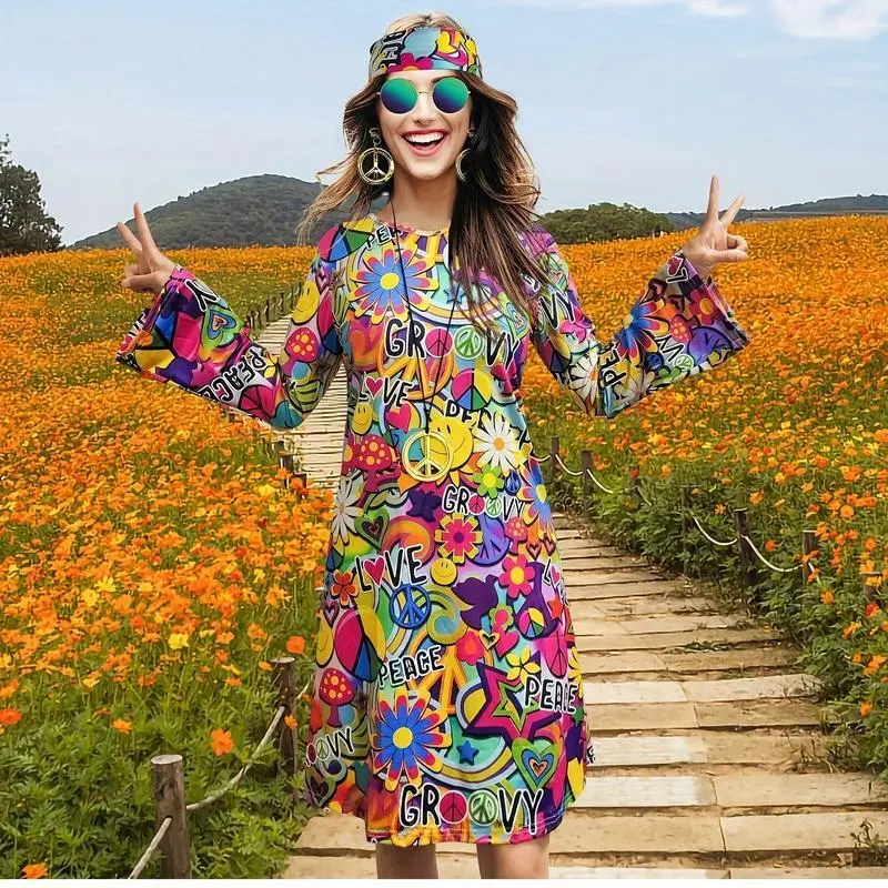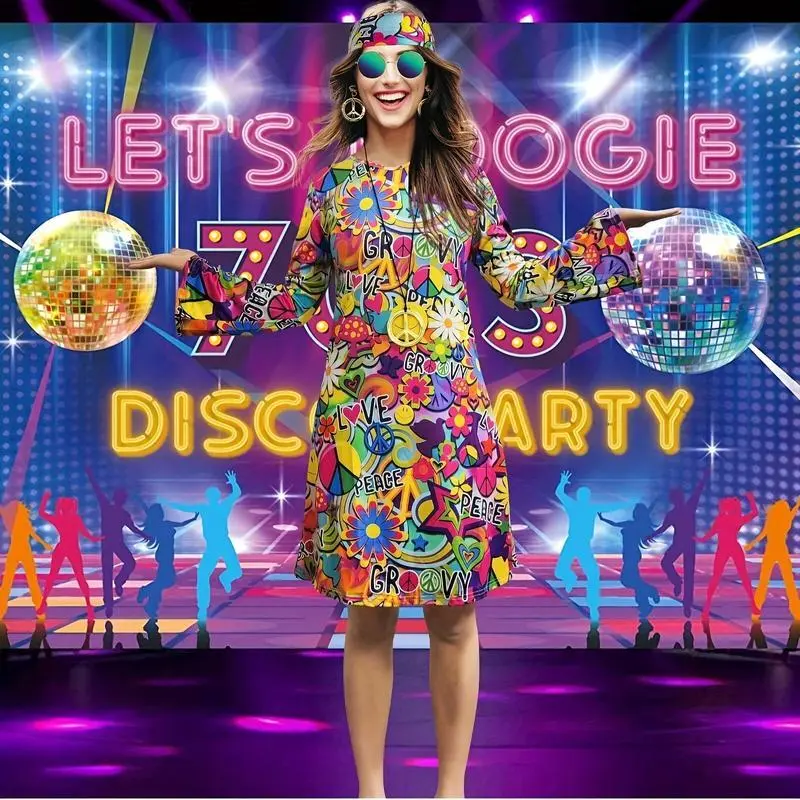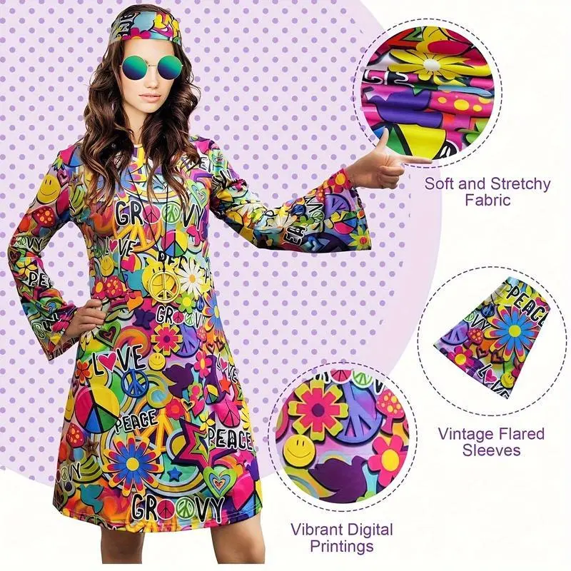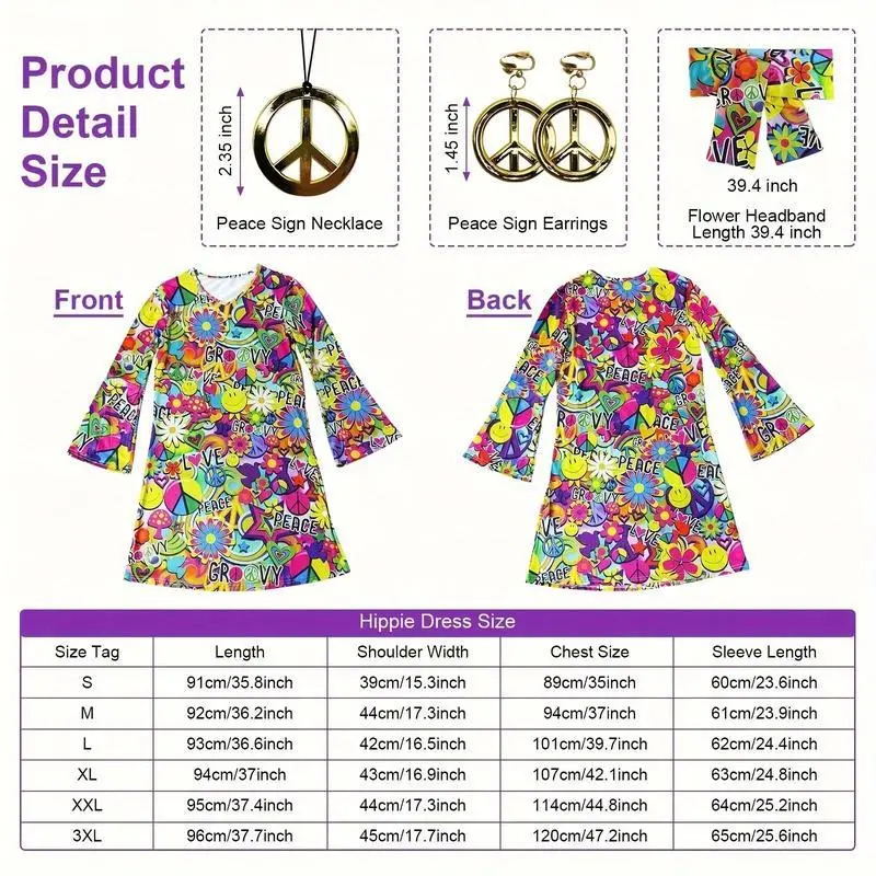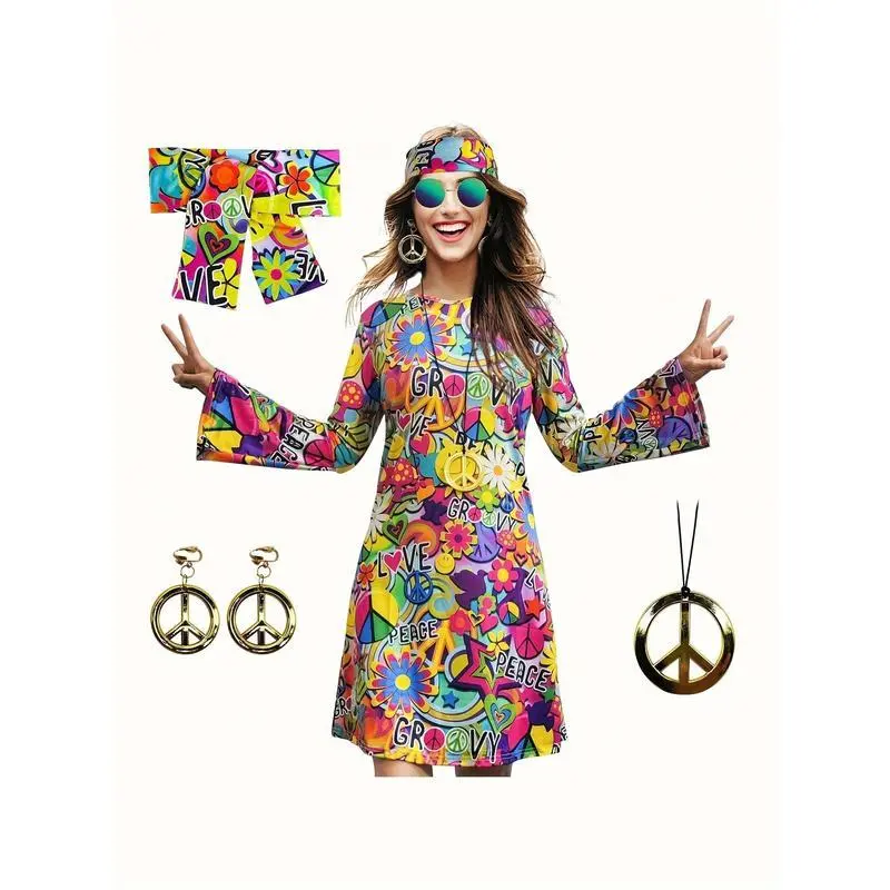 5pcs70s80sHippieDressCostumesNecklaceEarringsFashionGlassWomenDiscoOutfit,60sPartyCostume,PartyRetroDresses