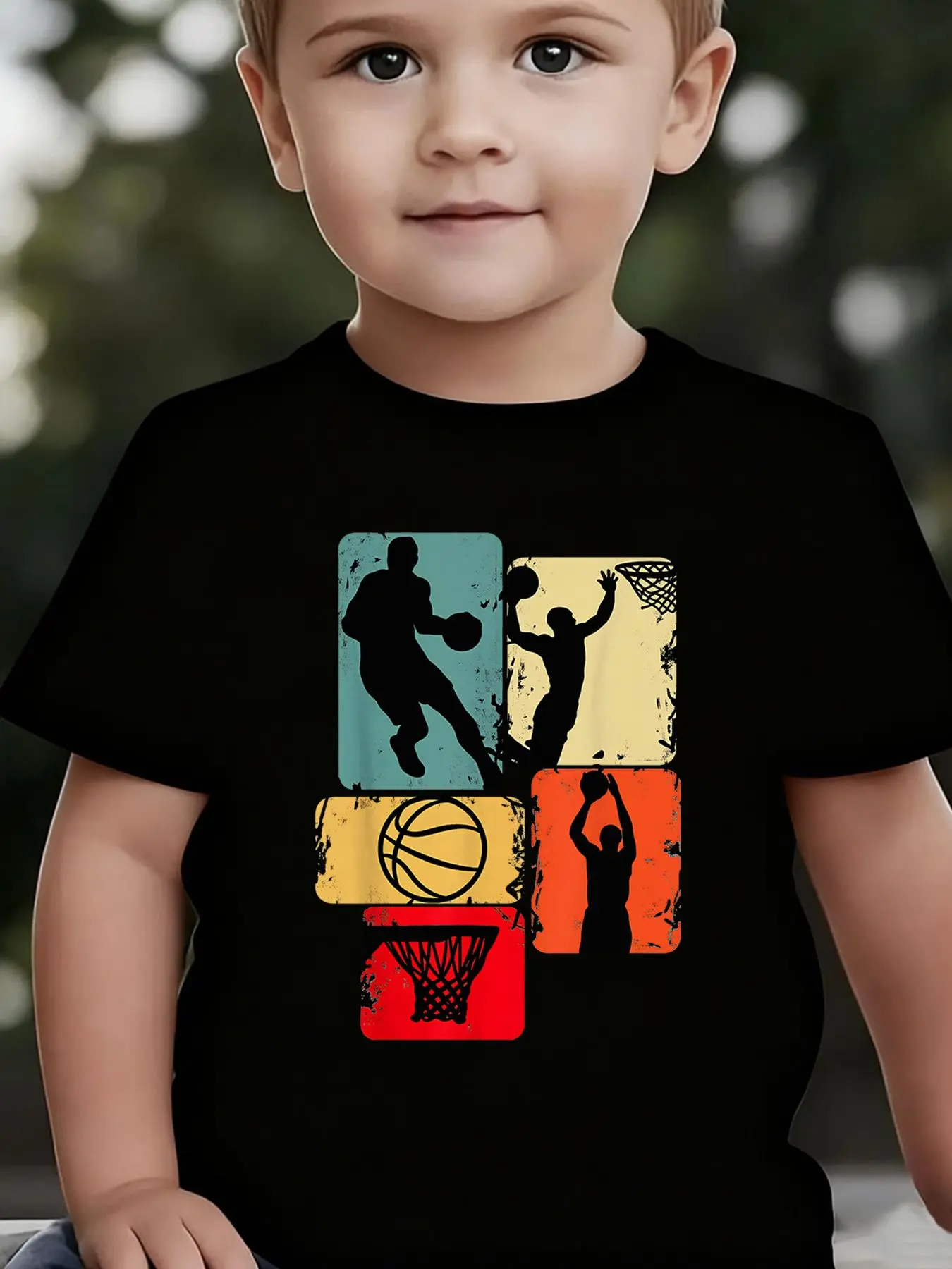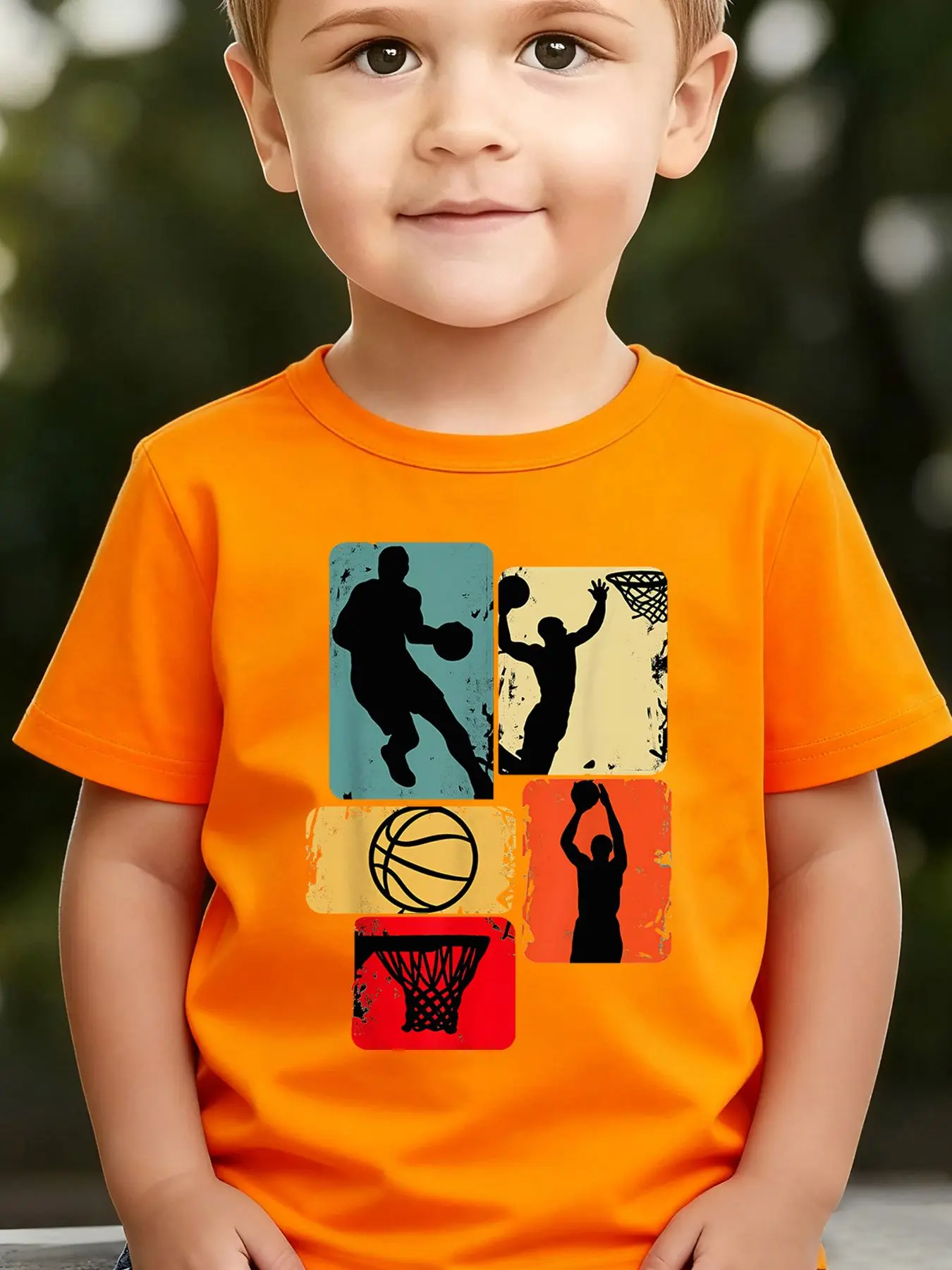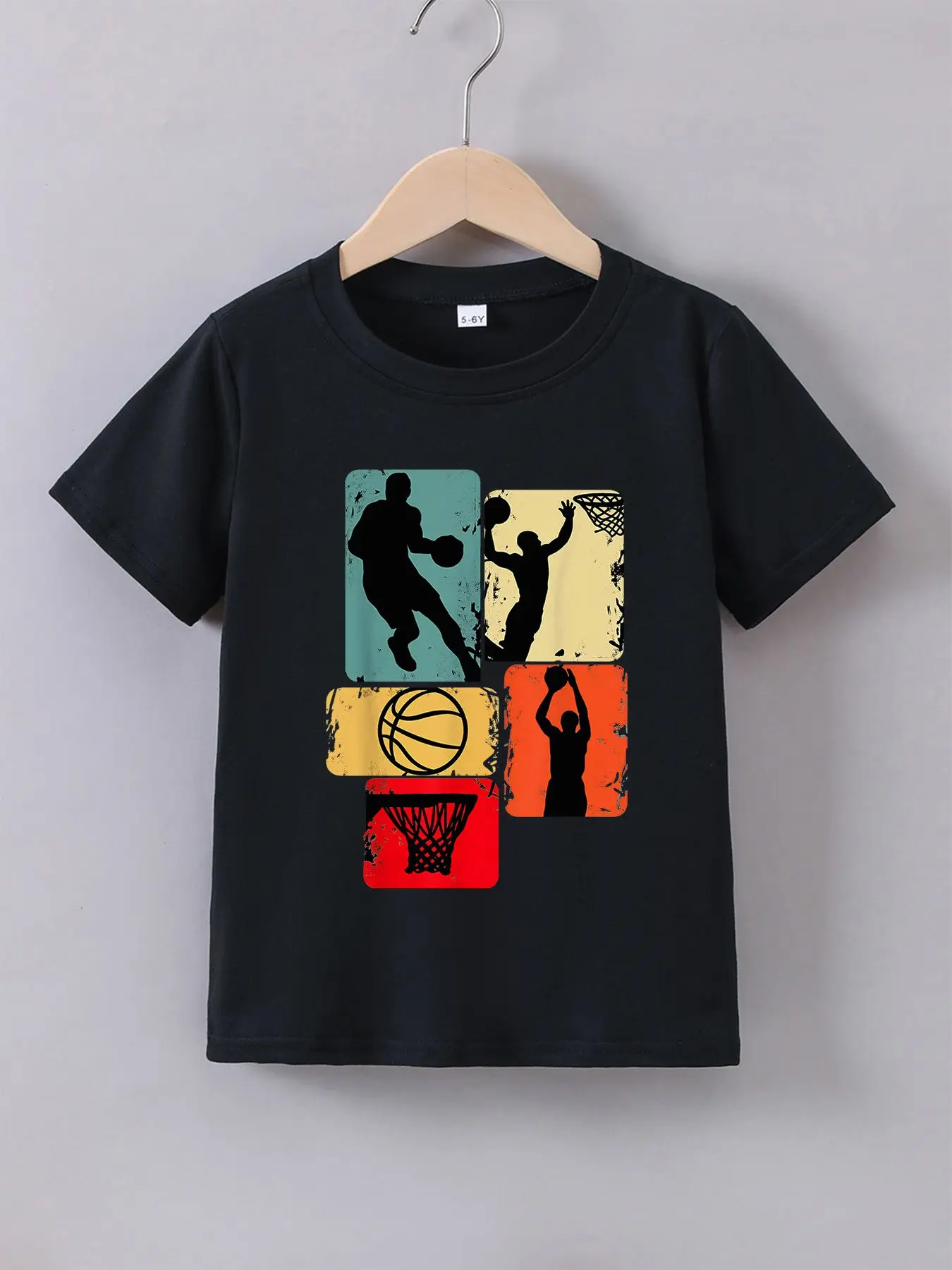 Boys' Summer Breathable & Comfortable "Retro Basketball Silhouette Collage" Cartoon Print (3-12Y) Casual Sports T-Shirt