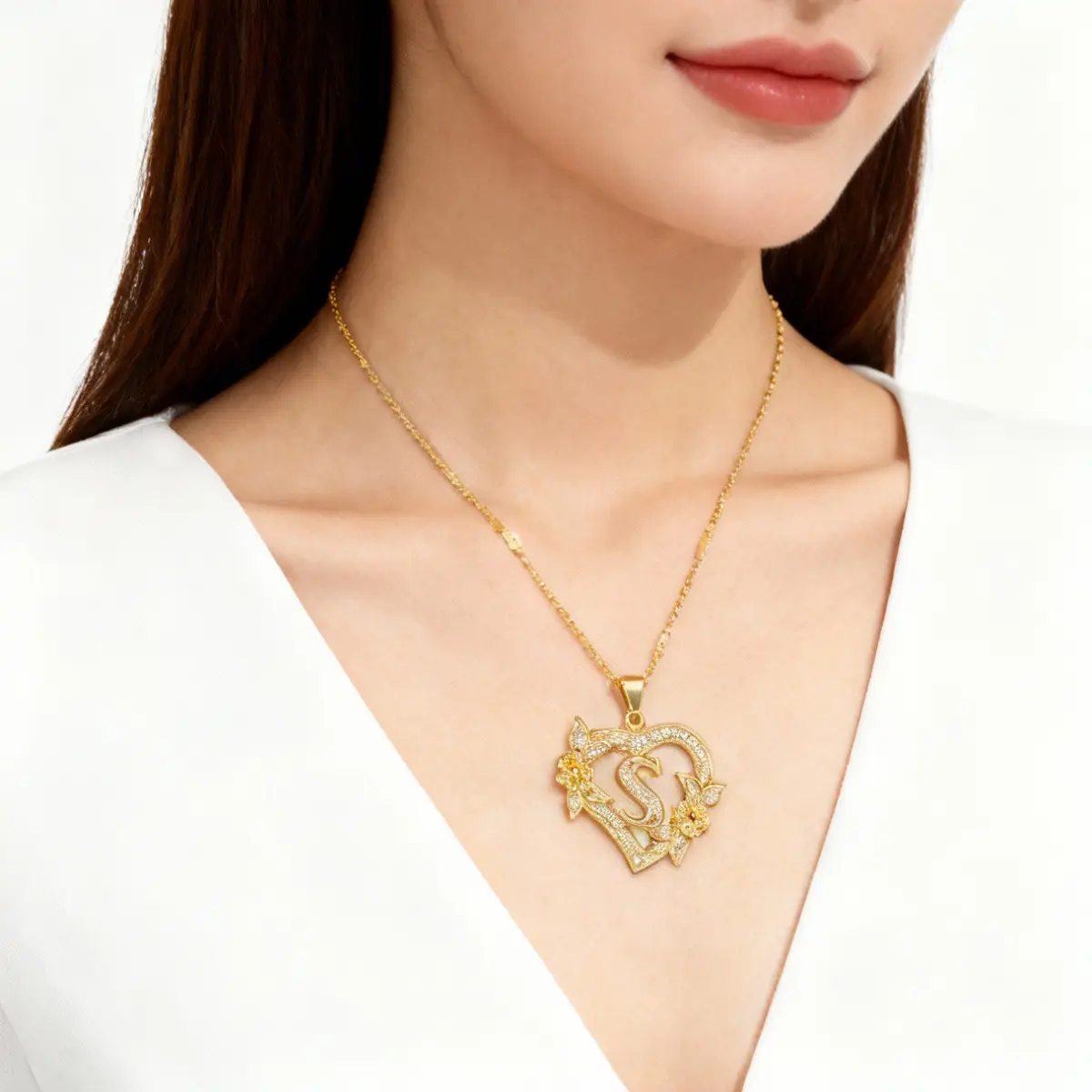 Summer women's heart-shaped necklace, stainless steel necklace with diamond and floral decorations, suitable for girls' daily fashion wear