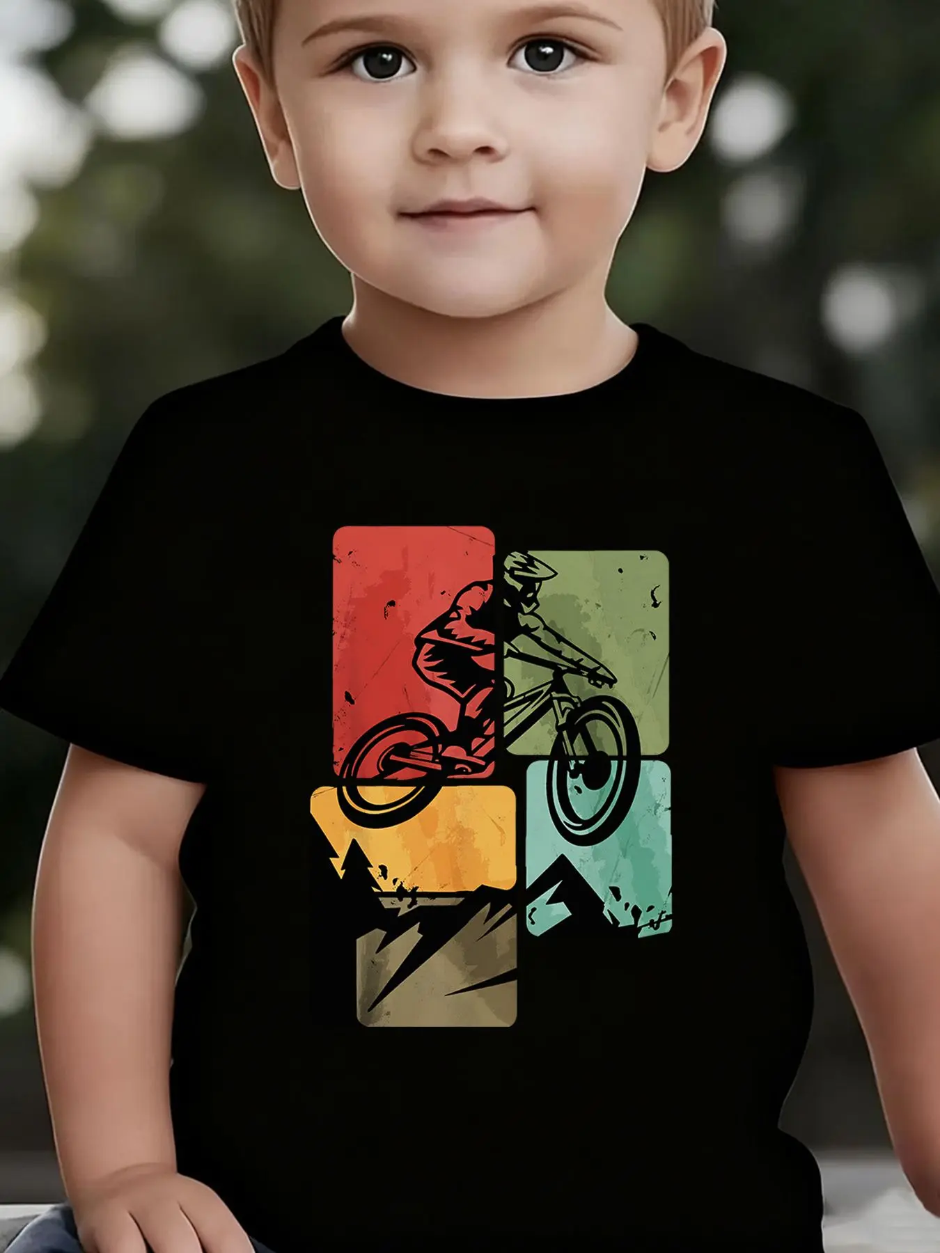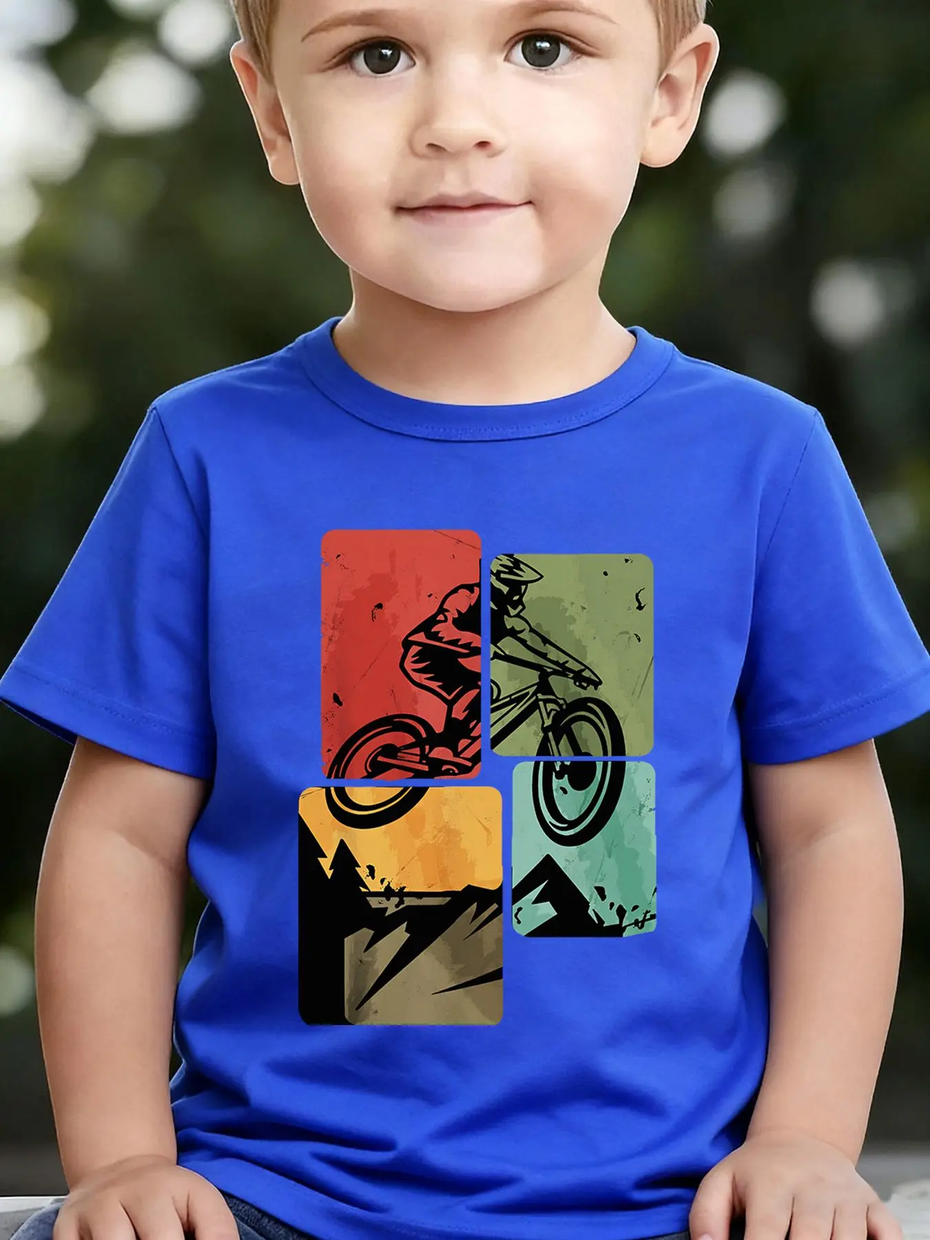 Boys' Summer Breathable & Comfortable "Retro Riding Silhouette 4-Grid Collage" Cartoon Print (3-12Y) Casual Sports T-Shirt