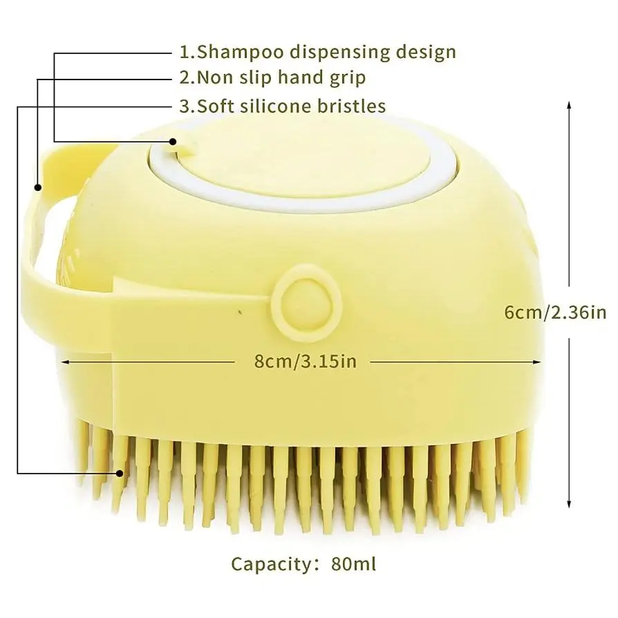 -[Comfortable Massage Feelings]With shampoo dispensing design, the dog massage brush not only can provide a quick and thorough washing of your pets but also massage the skin to improve blood circulation.This pet brush can give your pet a very comfortable bath experience.