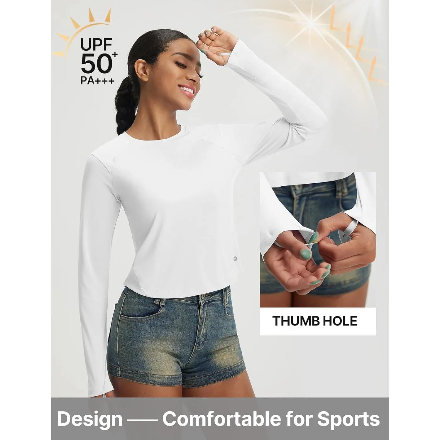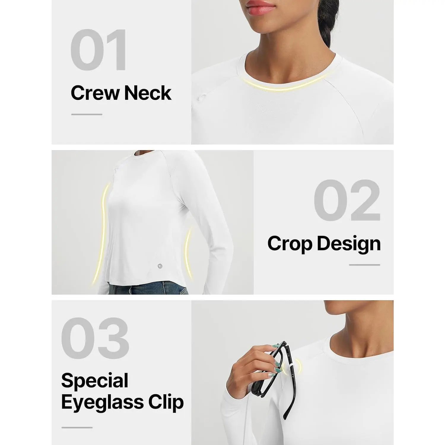 Reliable UPF 50+ Protection: These long sleeve shirts provide trusted UPF 50+ protection, effectively blocking over 98% of harmful UV rays for worry-free wear. Cropped & Slim Fit: This 20" (S) top has a secure length and slim fit that shapes your waist. The flattering seams and curved hem enhance your figure, while the crew neck adds style. Its tailored cut allows full freedom of movement. Soft & Breathable Feel: Made from soft, lightweight fabric that is highly breathable and moisture-wicking for lasting comfort. Thoughtful Features: Thumb loops lock sleeves in place for no-slip comfort, an external eyewear loop on the shoulder allows for convenient storage of glasses when out or during exercise. Versatile Wear: Works perfectly as a base layer, rash guard for swimming, or standalone tops for hiking, yoga, and casual days. Essential activewear for an active lifestyle.
