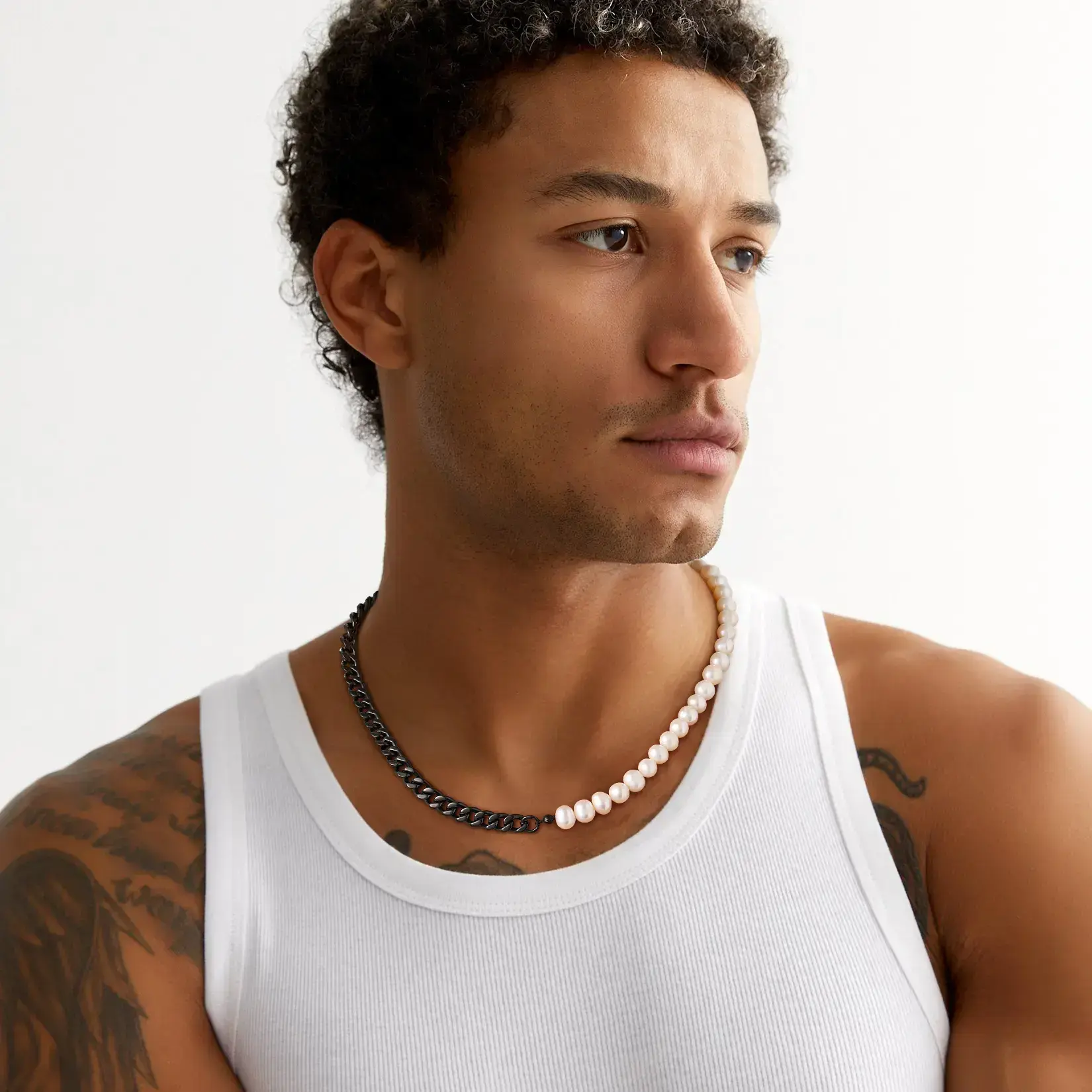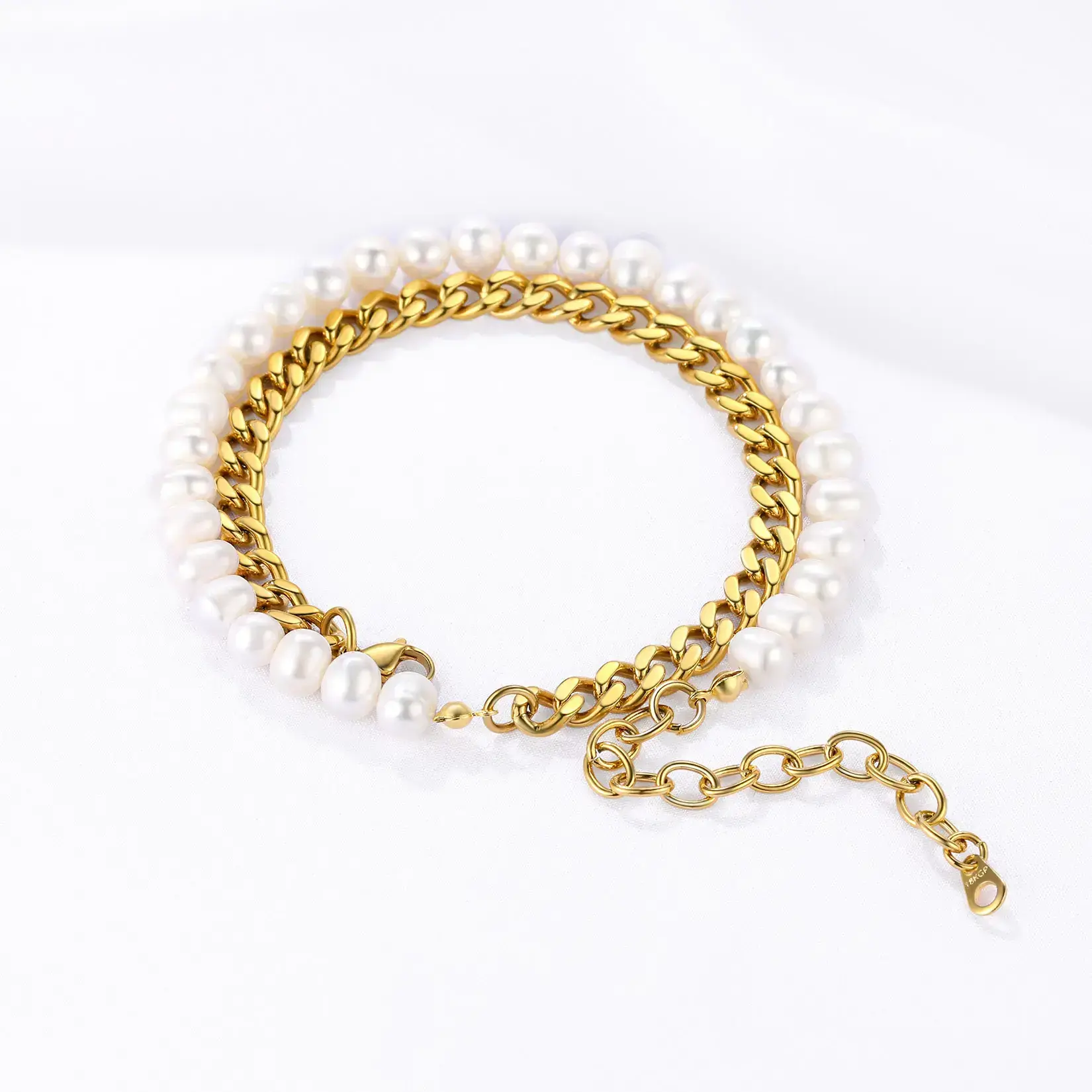 Necklace, half 8MM white pearl and half 8MM Cuban chain