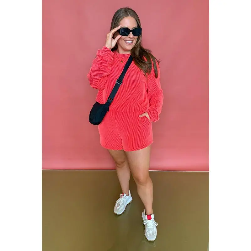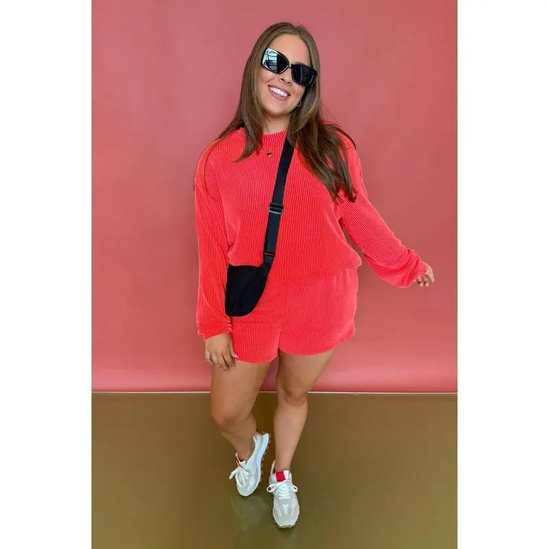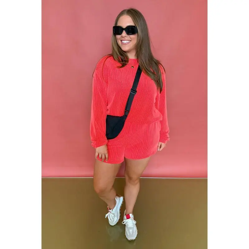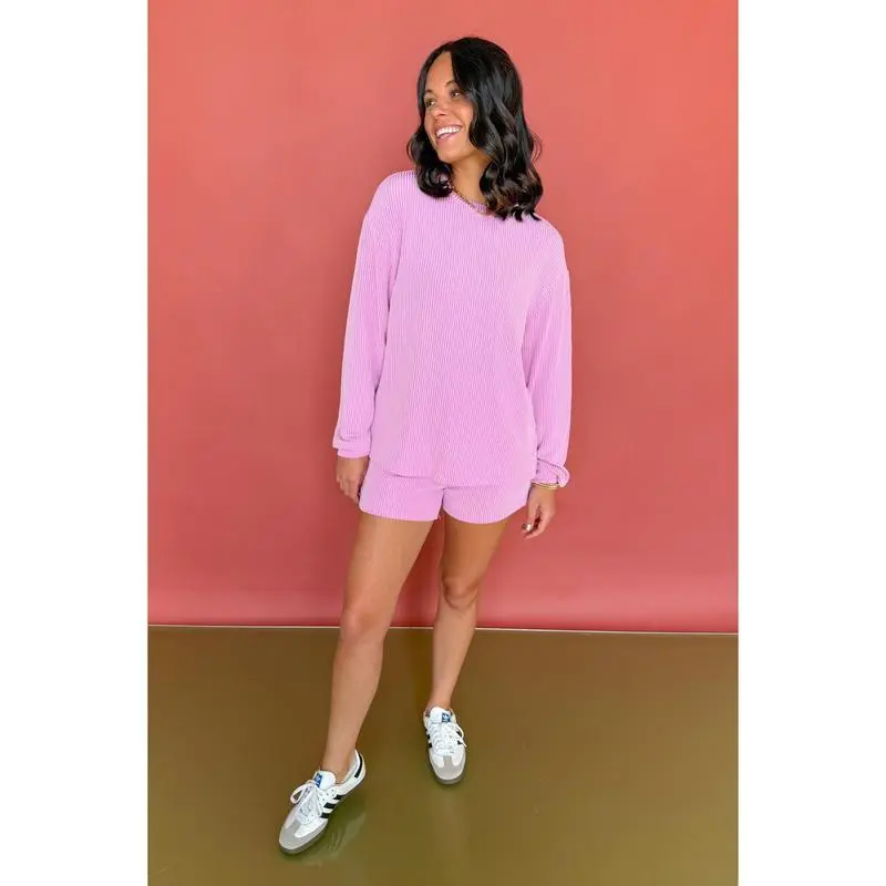 Grab this cozy set and enjoy the changing of the weather with us! This ribbed set includes a long sleeve top and shorts. The top features a round neckline and flowy fit. The shorts have an elastic waistband and side pockets. Fit is true to size but if in between, size up. Linda wears a small.