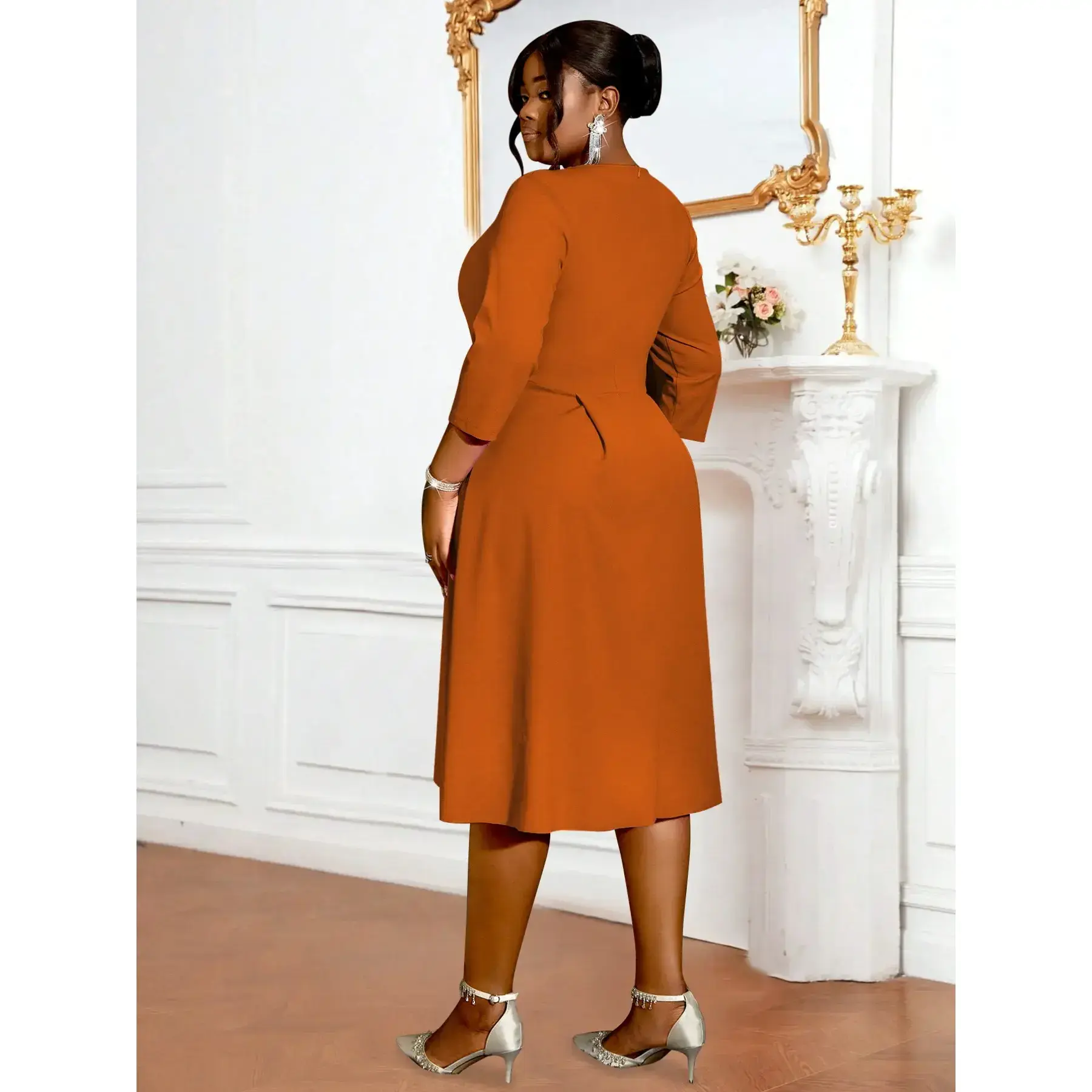 【A-Line Silhouette】: Features an A-line silhouette for a flattering fit and graceful appearance suitable for various occasions. 【Plissé Design】: Incorporates plissé detailing, adding texture and visual interest to enhance the overall look. 【Three-Quarter Sleeves】: Designed with three-quarter sleeves providing coverage while maintaining a chic and sophisticated vibe. 【Office & Party Ready】: Ideal for both office settings and parties, offering versatility for different event needs. 【Autumn Collection】: Part of the autumn collection, perfect for fall season wear and matching seasonal trends.