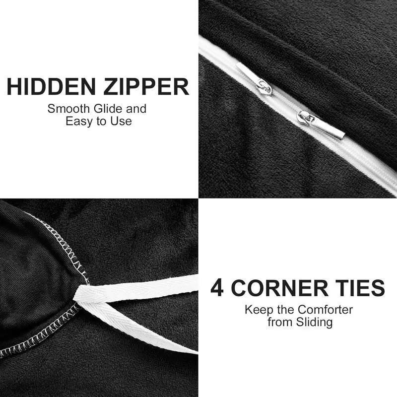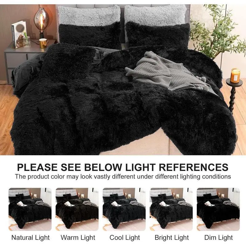 ?LUXURY AND SOFT? The front of the fluffy comforter cover is microfiber plush, which is super soft and comfortable. The is silky fabric that is delicate and -friendly, locking in warmth, gives you a warm and cosy sleep in the cold winter. ?WARM, COZY & STYLISH? This fluffy bed set brings you the ultimate comfortable sleep experience, like sleeping on a cloud so you can fully relax in your bed. The stylish solid color design adds luxury to your room and is the choice for updating your bathroom. It's also a warm for your family, friends or colleagues, making them feel your caring. ?EASY TO INSTALL? The faux comforter cover has a zipper closure at the bottom, and the metal zipper is smooth and durable, easy to disassemble; The 4 corner ties inside the plush comforter cover helps keep the quilt in place and slipping for comfortable sleeping at night. ?OPTIONAL SIZE? The black shaggy duvet cover set includes 1 x size duvet cover (90"x 90"), 2 x Pillowcases (20" x 26"), and 1 x Throw pillow cover (18" x 18"). Note: Quilts and sheets are not included. This fluffy duvet cover set comes in a variety of colors and sizes so you can choose according to your preference and bedroom style. ?CARE INSTRUCTION?The comfortable fuzzy bedding set can be machine washable in cold water, gentle cycle, tumble dry low, do not bleach, do not iron. To protect the , turn it inside out when cleaning. We recommend cleaning before first use. Please feel free to contact if you have any question, we will reply you within 24 hours and give you a satisfied answer.