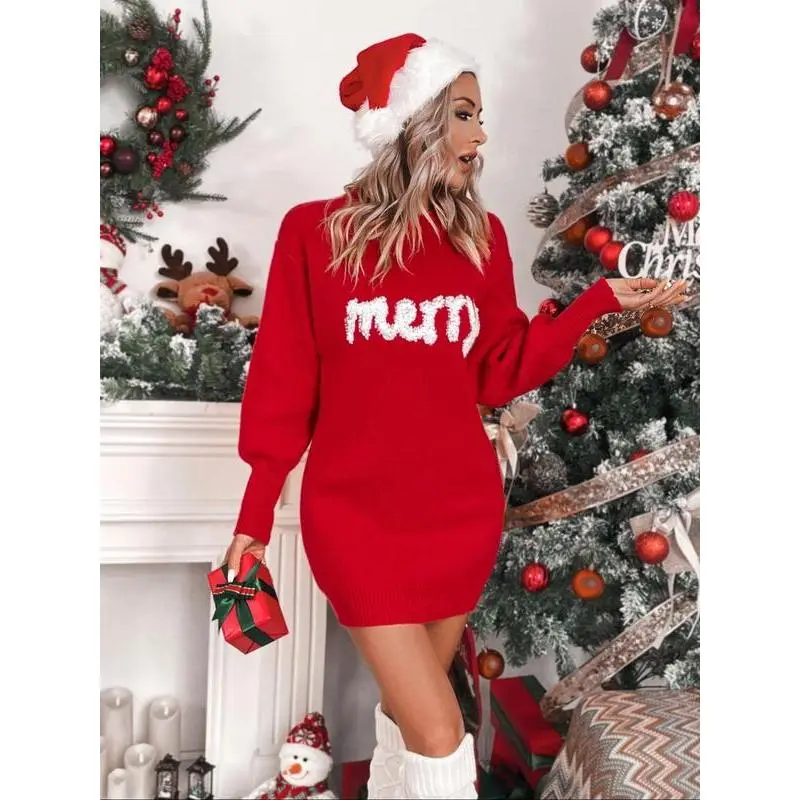 Women'sChristmasLetterPrintDropShoulderSweaterDress,CasualLongSleeveRoundNeckJumperDress?forDailyOutdoorWear,WomenKnitwearforFall&Winter