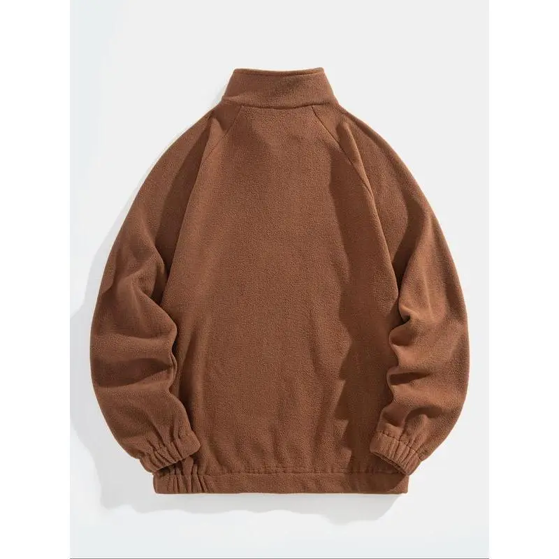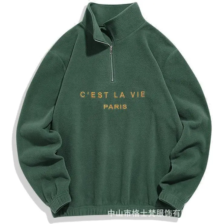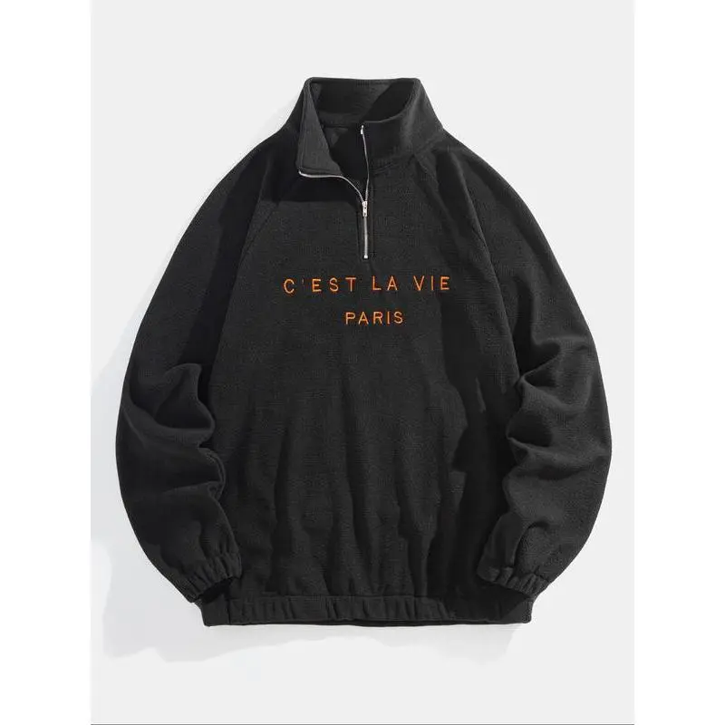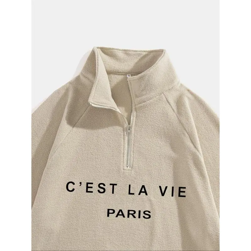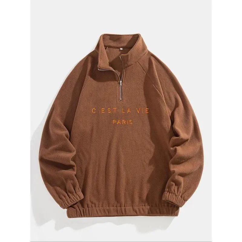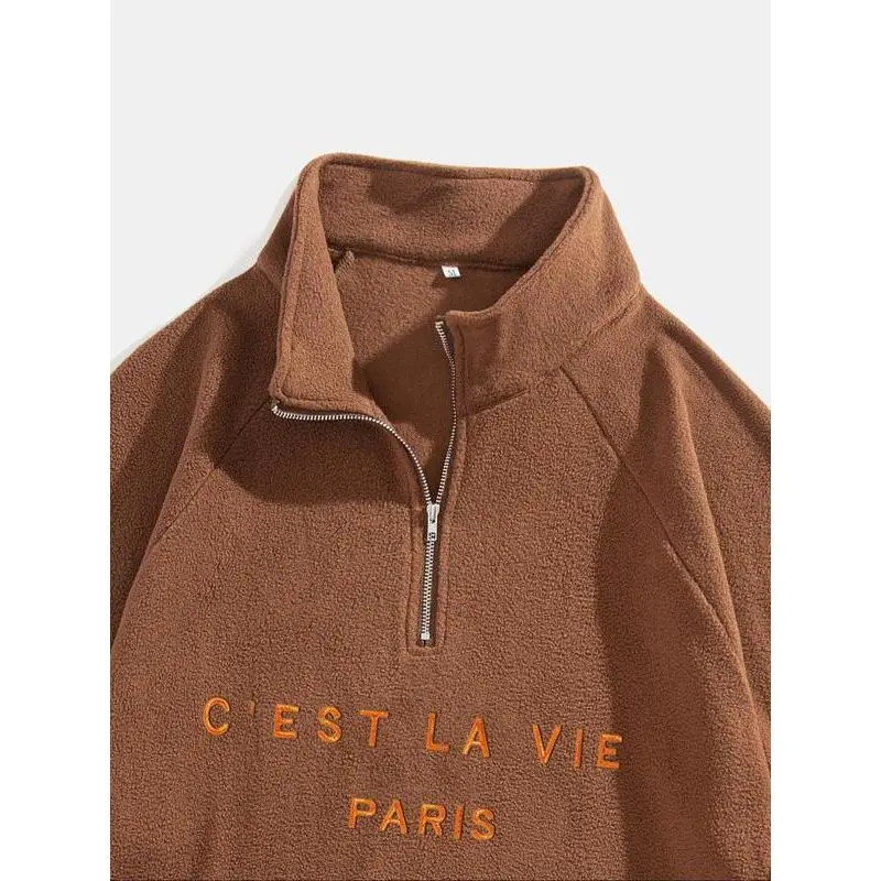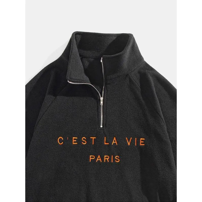 Men's "C' EST LA VIVE PARIS" Letter Embroidery Half Zip Polar Fleece Sweatshirt, Casual Regular Fit Long Sleeve Stand Collar Pullover for Fall & Winter, Fashion Men's Clothes for Daily Wear