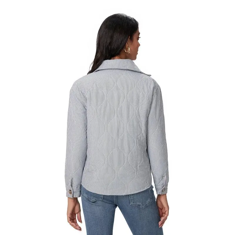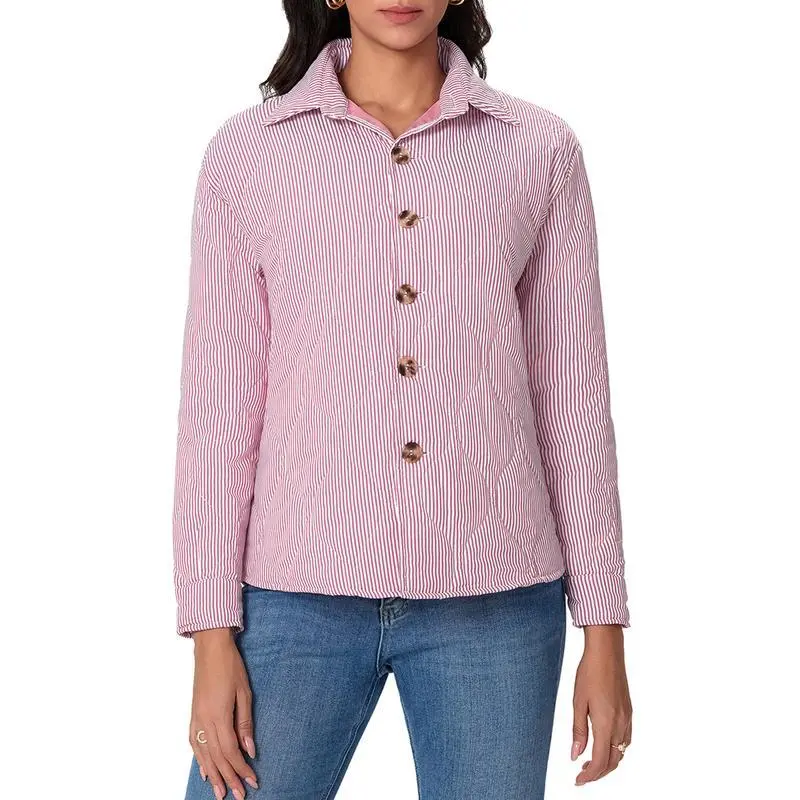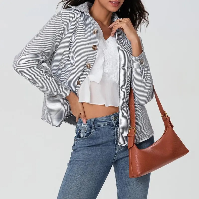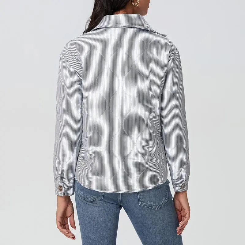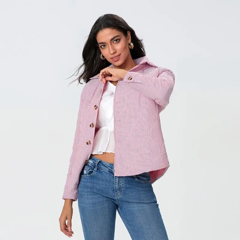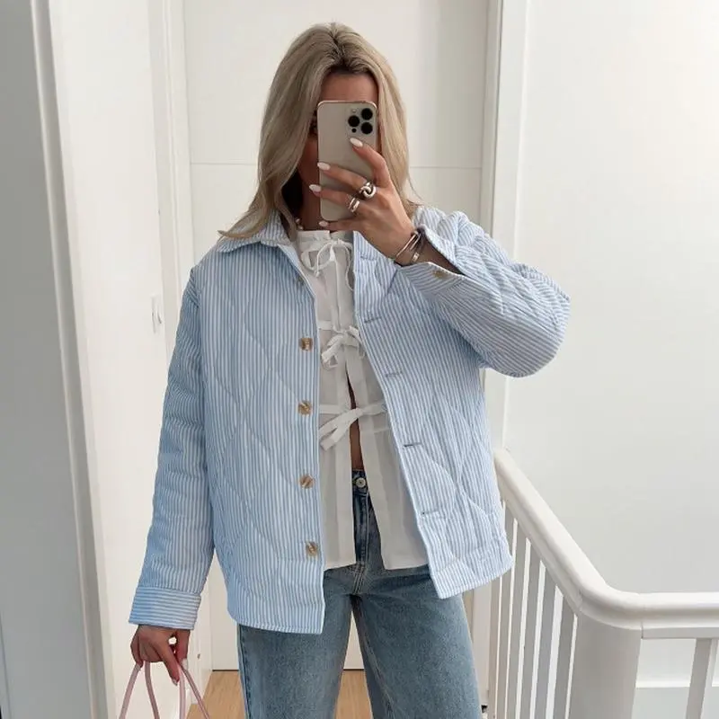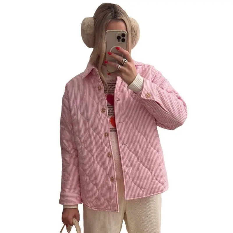 Women'sPufferJacketStripeTurn-DownCollarButtonsQuiltedCoatFallWinterLongSleevePaddedJacketOuterwearCottonWomenswearCheckLight