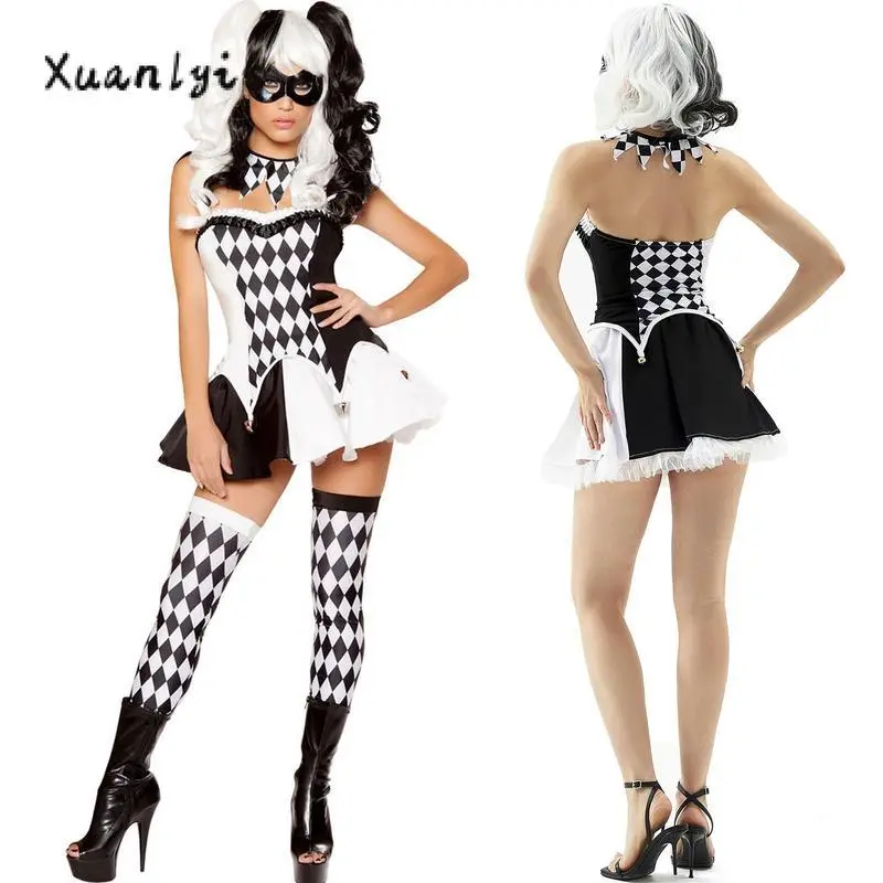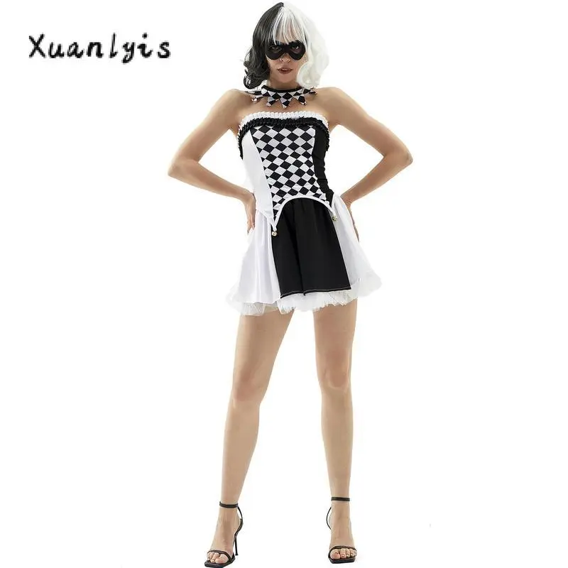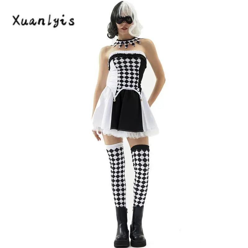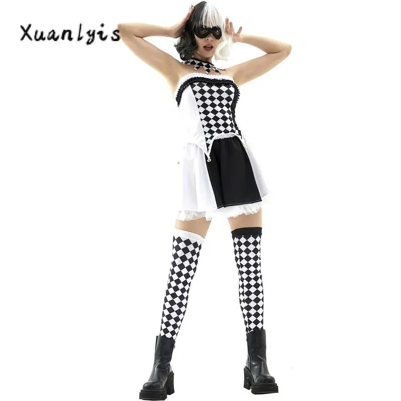 HalloweenClownCostumeforWomenPlaidPrintCircusPartyCostumeTubeTopsSkirtLongSocksSetWomenswearAccessories