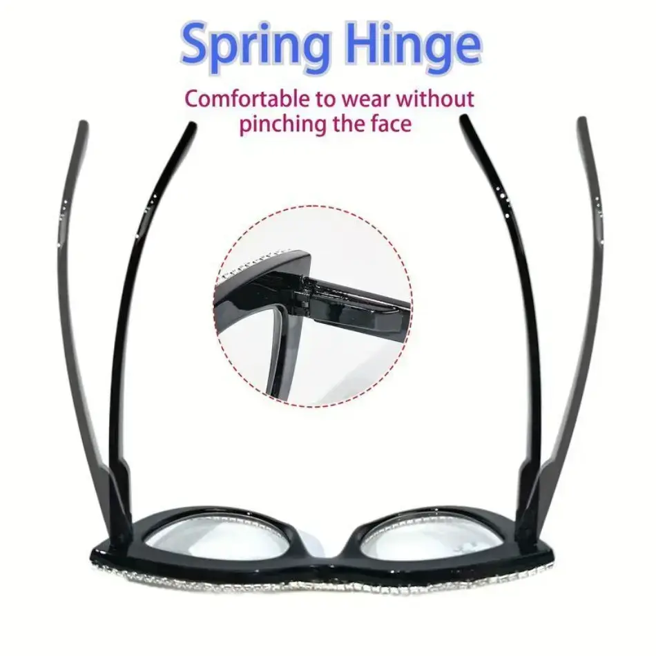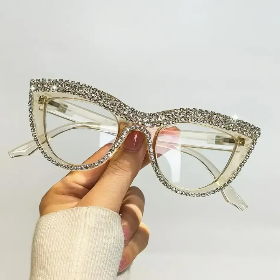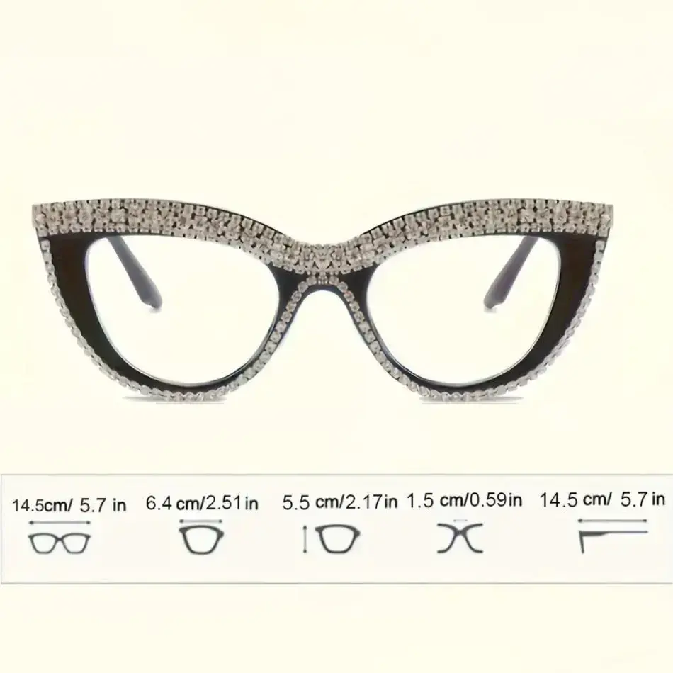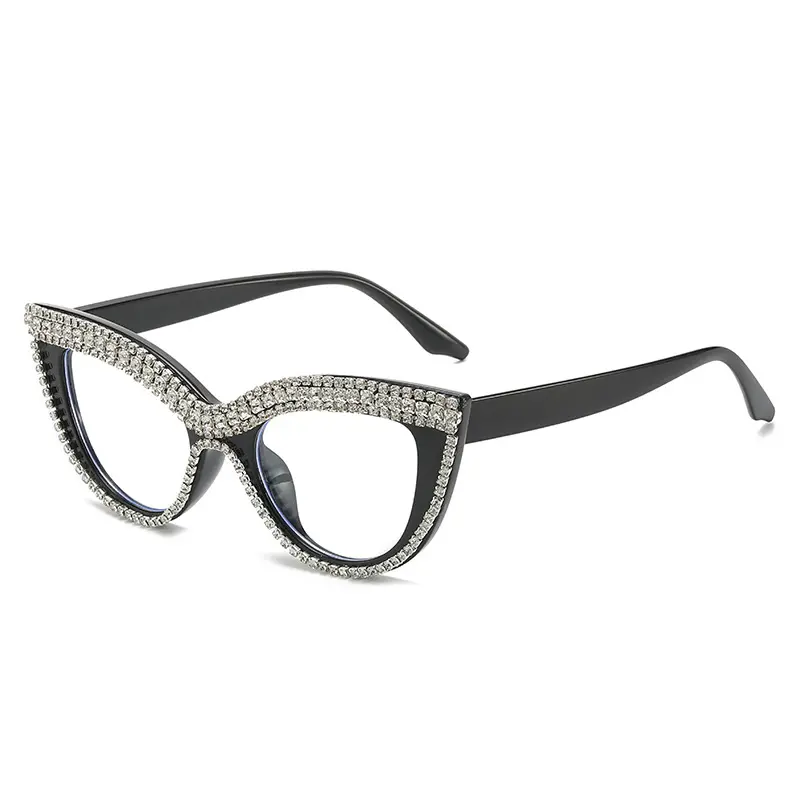 2026 new women's cat eye rhinestone anti blue light glasses full frame sparkling crystal glasses black semi transparent PC lenses, suitable for daily office screens