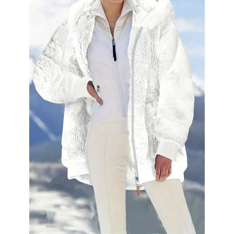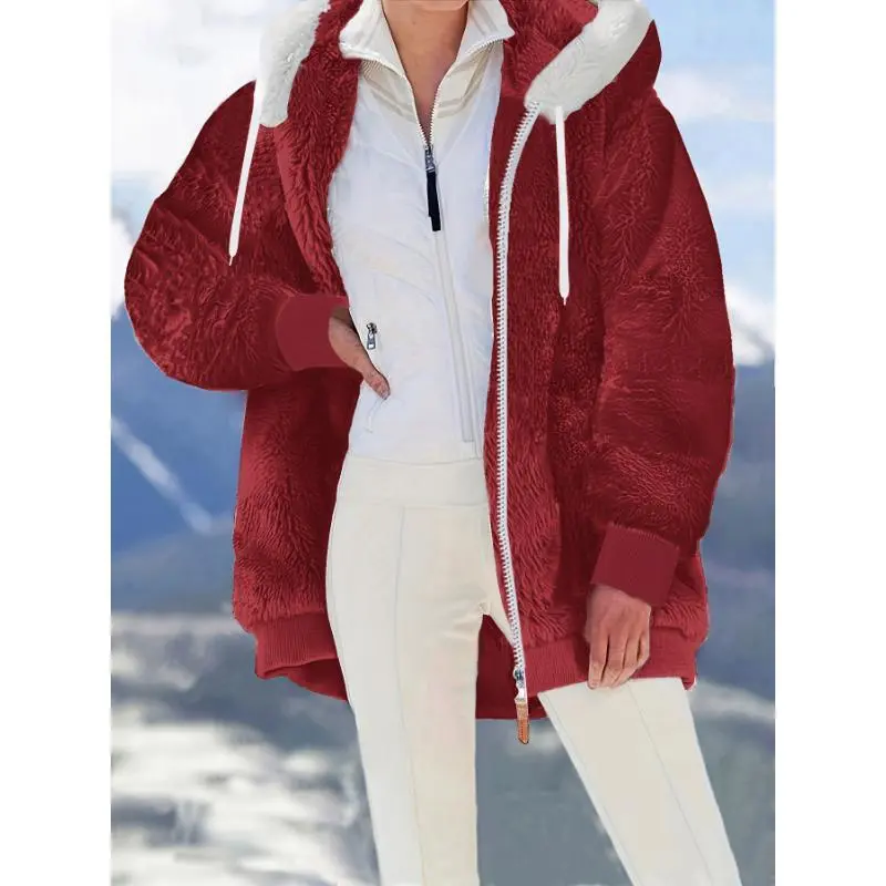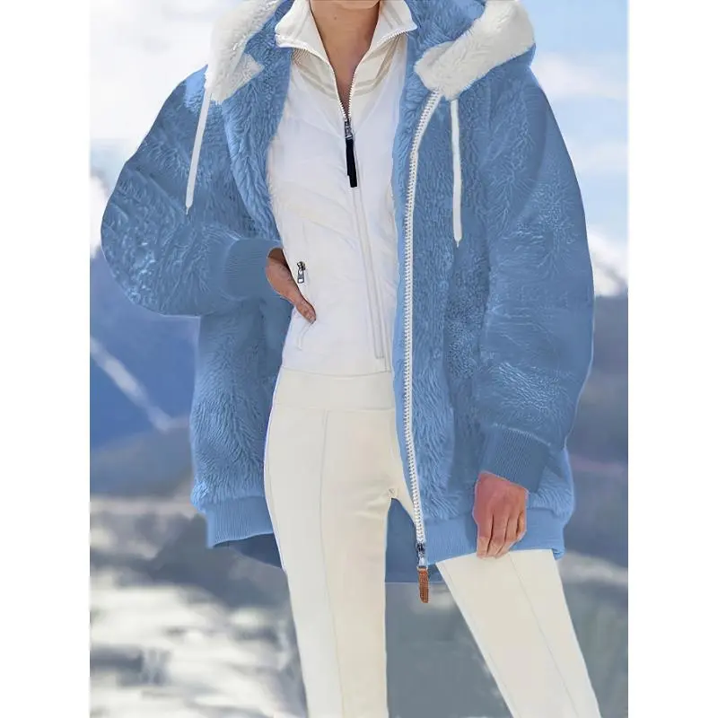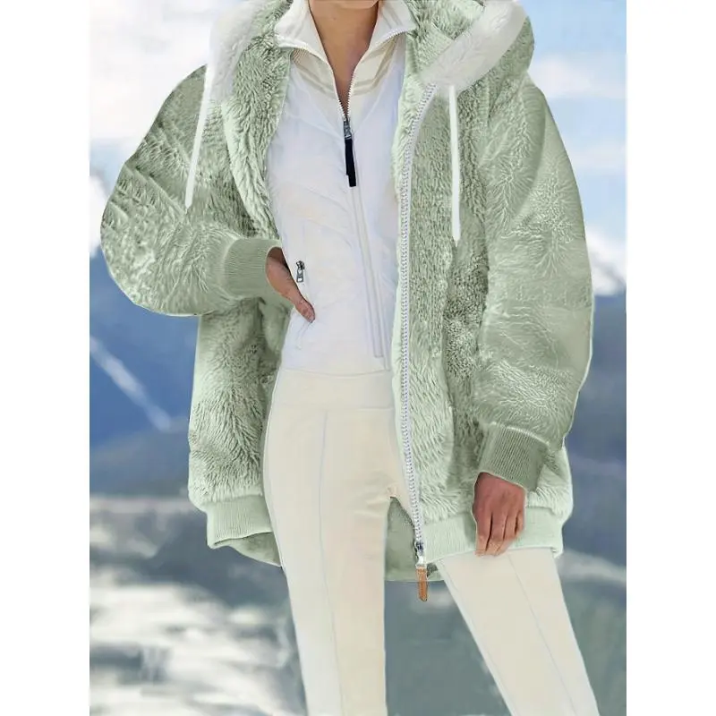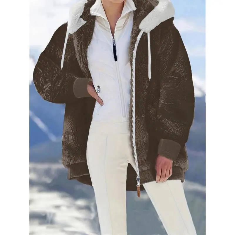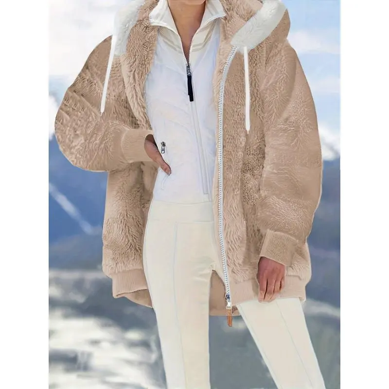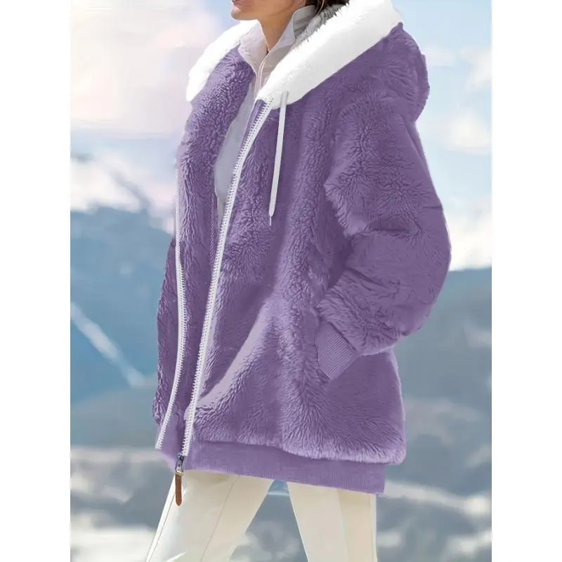 Plus Size Colorblock Fuzzy Hooded Coat, Casual Long Sleeve Zipper Coat For Winter, Women's Plus Size Clothing