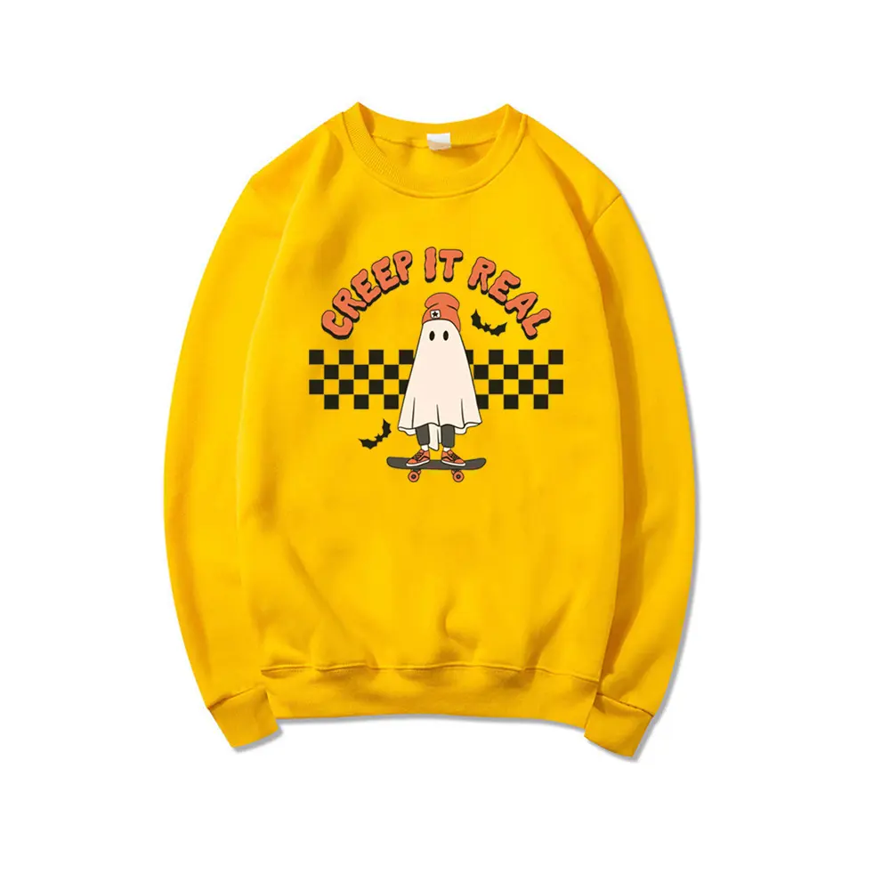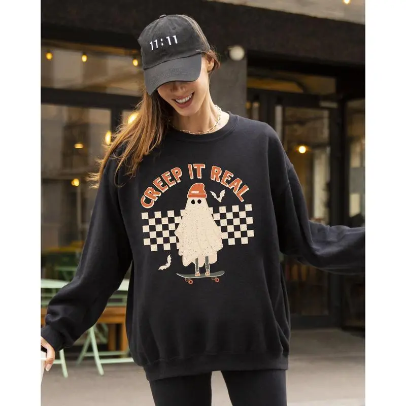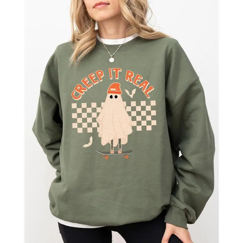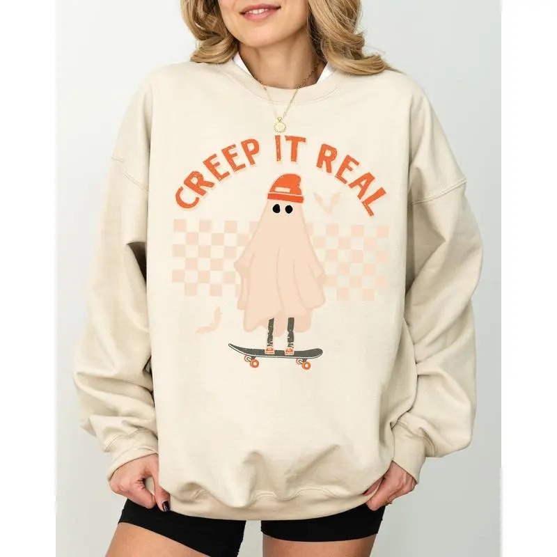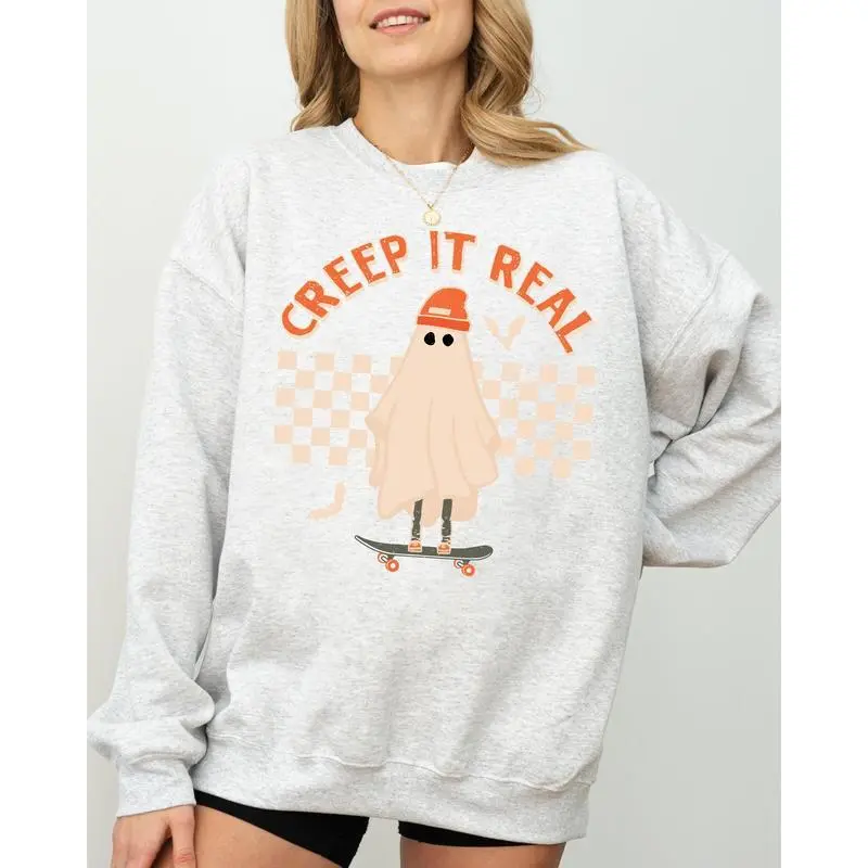 Unveil your spooky side with our Creep It Real, Retro Ghost, Skeleton, Funny, Spooky, Witch, Aesthetic, Meme, Halloween, Costume Sweatshirt. This unique sweatshirt is the perfect blend of comfort and eye-catching design, tailored for fans of all things whimsical and eerie. Whether you're gearing up for Halloween festivities or just want to add some fun to your wardrobe, this sweatshirt ensures you stand out in style. Material: Cotton/Polyester Blend