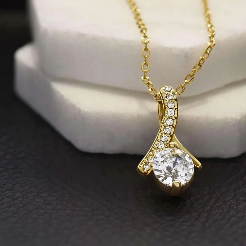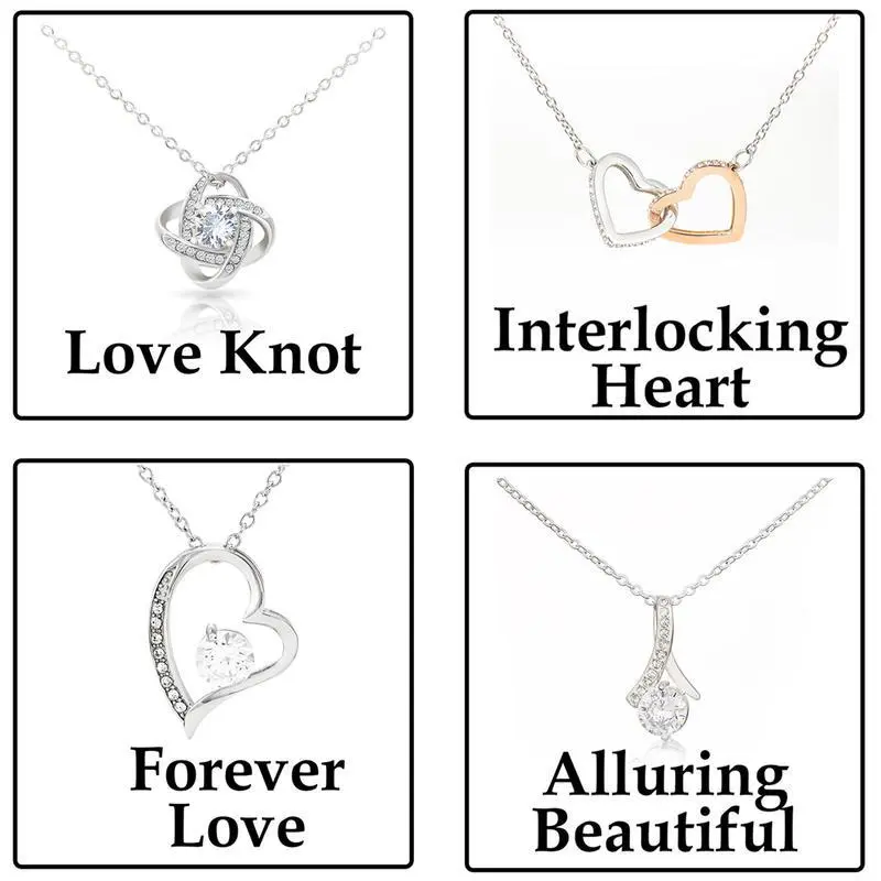 Love Knot Necklace: The Love Knot Necklace represents an unbreakable bond between two souls. This symbol of eternal love is a forever favorite and trending everywhere. Surprise your loved one with this gorgeous gift! The beautiful Love Knot is crafted with brilliant 14k white gold over stainless steel or 18k yellow gold over stainless steel, and swings from an adjustable cable chain allows the necklace to be worn at 18 inches to 22 inches in length, fastened securely with a lobster clasp. The center cubic zirconia crystal measures 6mm in diameter, and is surrounded with smaller cubic zirconia, showcasing added sparkle and shine to this gorgeous gift. You must see it for yourself! Alluring Beauty Necklace: Melt her heart with this alluring beauty necklace gift. The petite ribbon shaped pendant is finished with 14K white gold over stainless steel or 18k yellow gold over stainless steel, and is embellished with dainty clear crystals surrounded by a sparkling 7mm round cut cubic zirconia. The adjustable cable chain allows the necklace to be worn at 18 inches to 22 inches in length. Interlocking Hearts Necklace: Two hearts embellished with Cubic Zirconia stones, interlocked together as a symbol of never-ending love. Made with high quality polished surgical steel and rose gold finish or 18k yellow gold finish. Cable chain measures 18 inches with a 4 inch extension, and fastens with a lobster clasp. Forever Love Necklace: Give a loving gift that will make her heart melt! This dazzling Forever Love Necklace features a polished heart pendant surrounding a flawless 6.5mm cubic zirconia, embellished with smaller crystals adding extra sparkle and shine. The pendant is crafted in your choice of 14K white gold over stainless steel or 18k yellow gold over stainless steel, and dangles from an adjustable cable chain secured with a lobster clasp. 【 Standard Box 】Complimentary black and white gift box size: 3.25 x 3.25 x 1.25 inches (8.25 x 8.25 x 3.2 cm). 【 Mahogany Style Luxury Box 】Made from solid mahogany, soft felt lining, with a built-in spotlight to show off your perfect gift. Your Order Includes: • Jewelry Box of Your Choice (Standard or Wooden) • Message Card Anniversary, Birthday, Christmas, Engagement, Father's Day, Graduation, Valentine's Day, Wedding