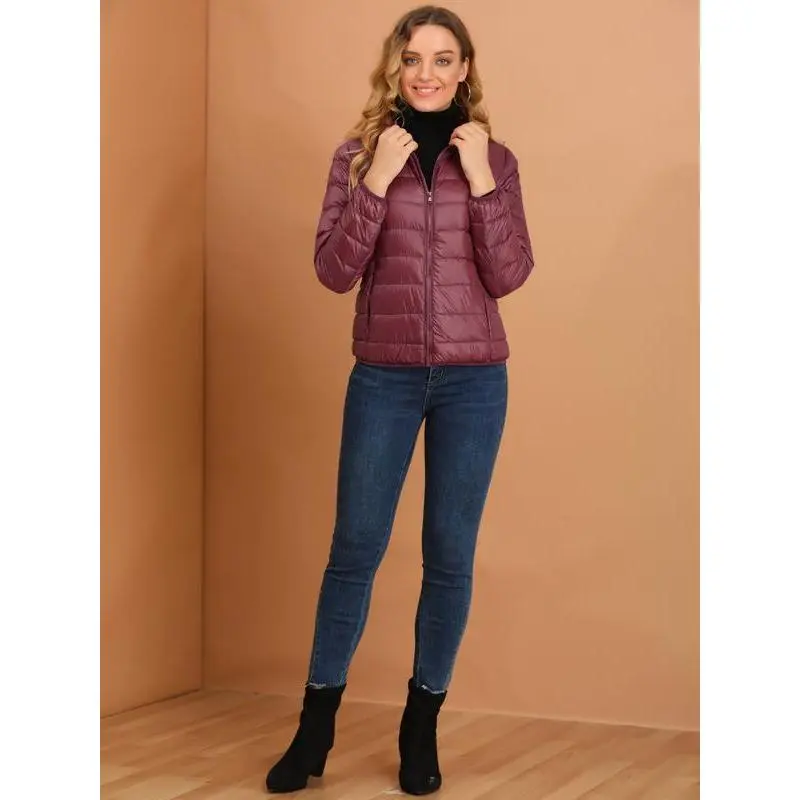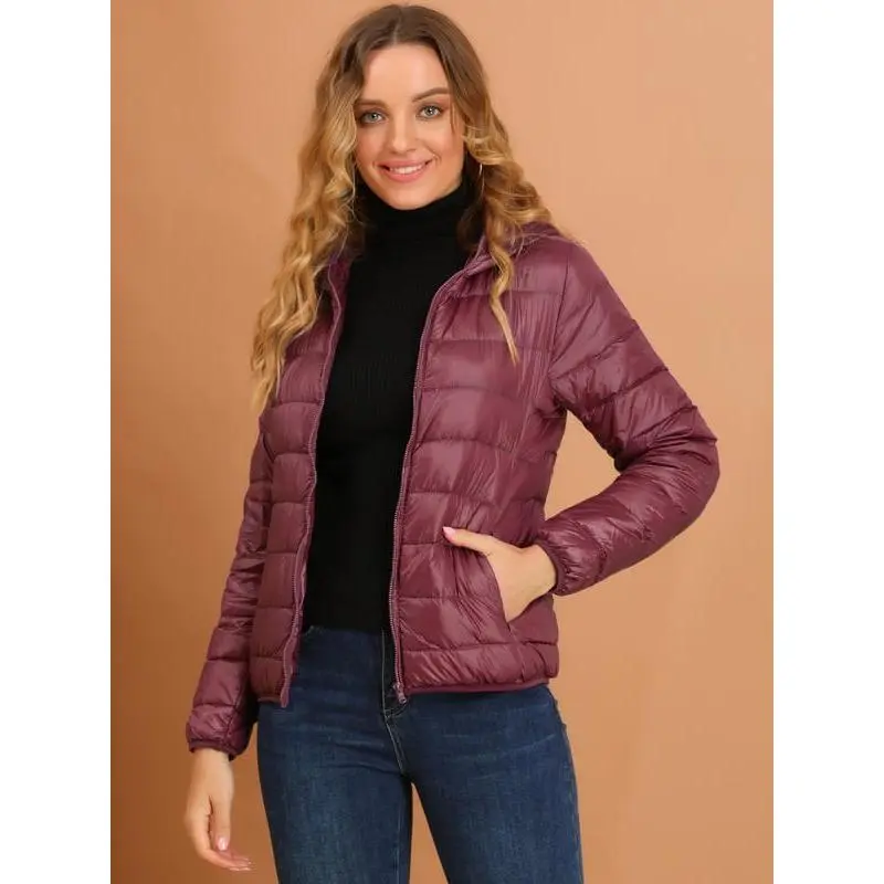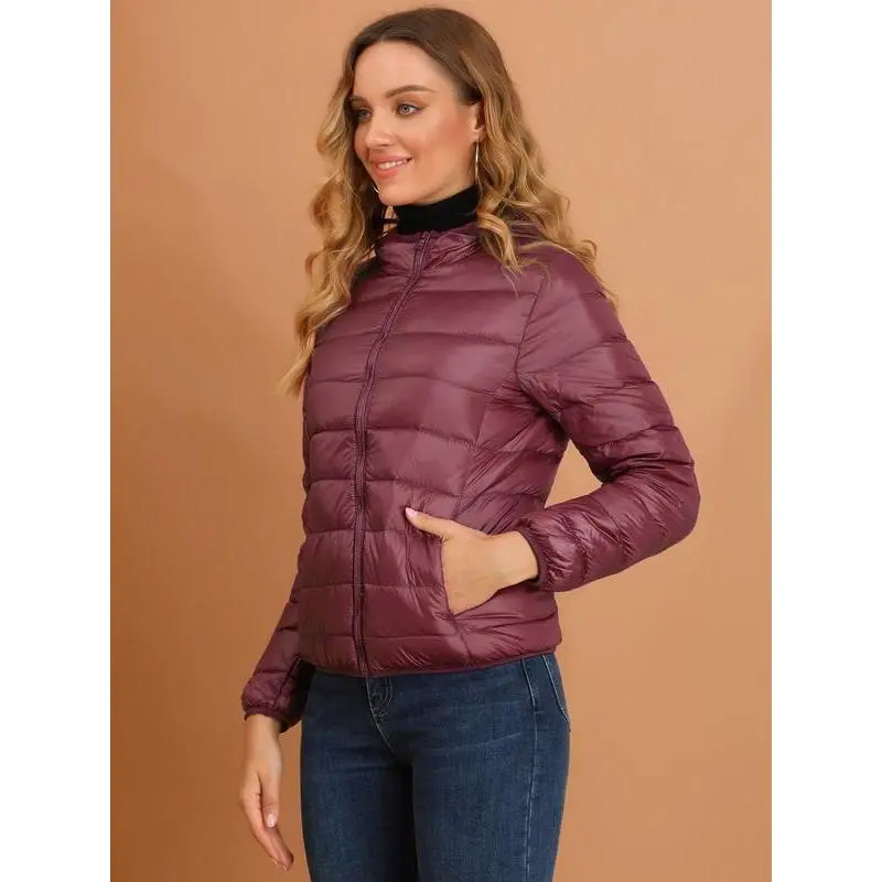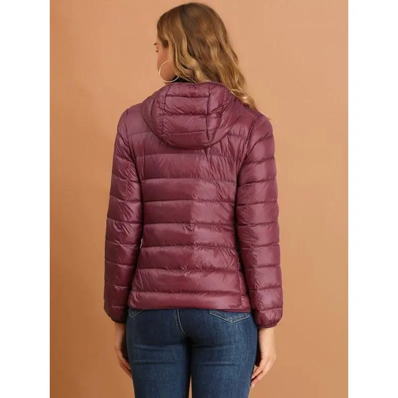 INSPIRE CHIC Puffer Coat Winter Long Sleeve Zip Up Hooded Lightweight Packable Down Jacket Burgundy