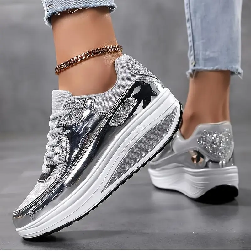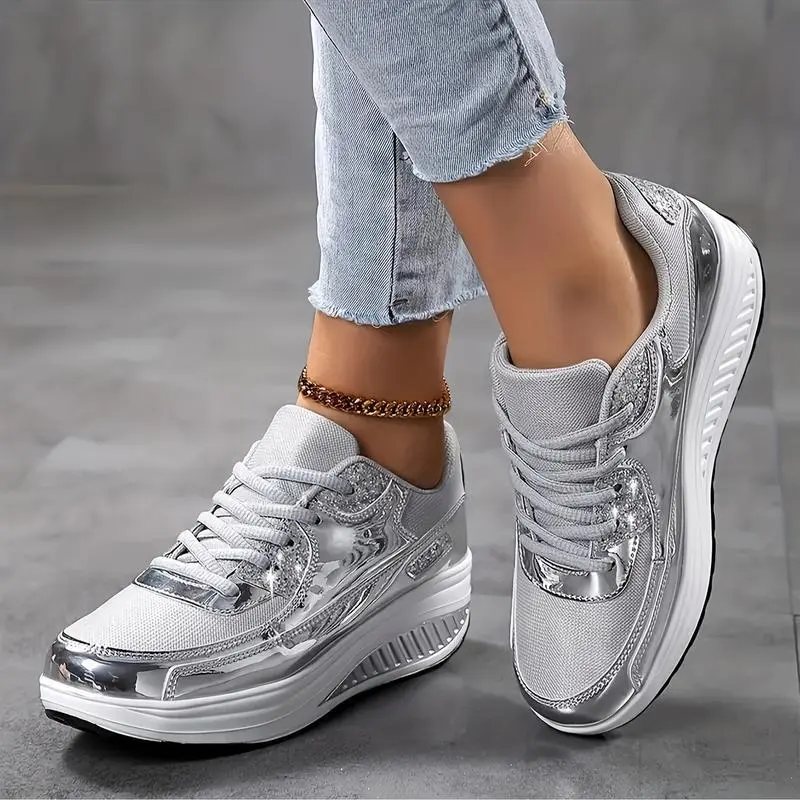 Women's Shiny Silver Glitter Platform Wedge Sneakers with Reflective Detail, Outdoor Walking Shoes Runner Trainer