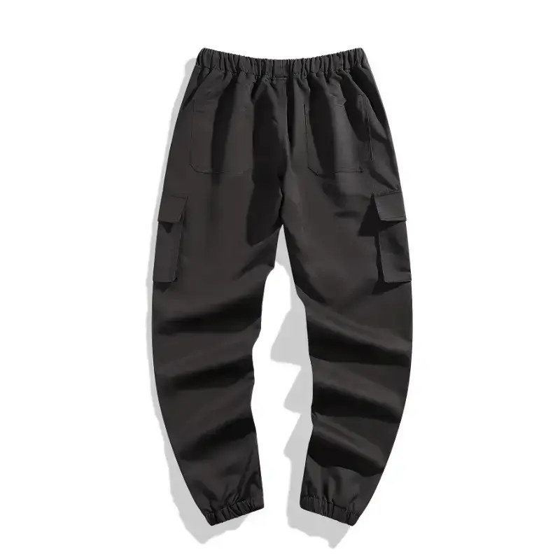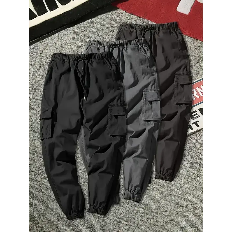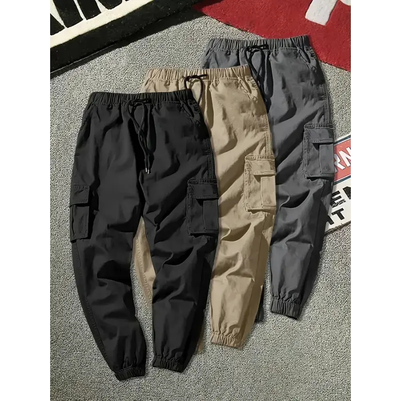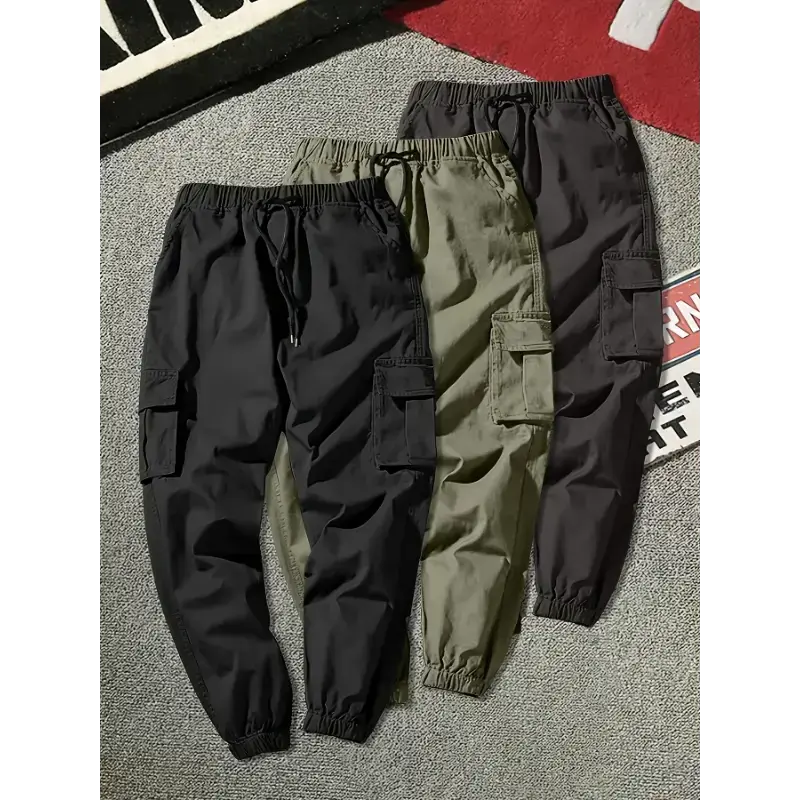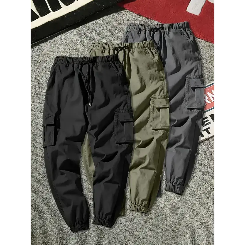 3-Pack Men'S Solid Color Cargo Pants, 100% Polyester, Non-Stretch, All-Season, Regular Fit, Drawstring Waist, Multi-Pocket Flap, Woven Fabric, 180g/m², for Weekend Casual Wear