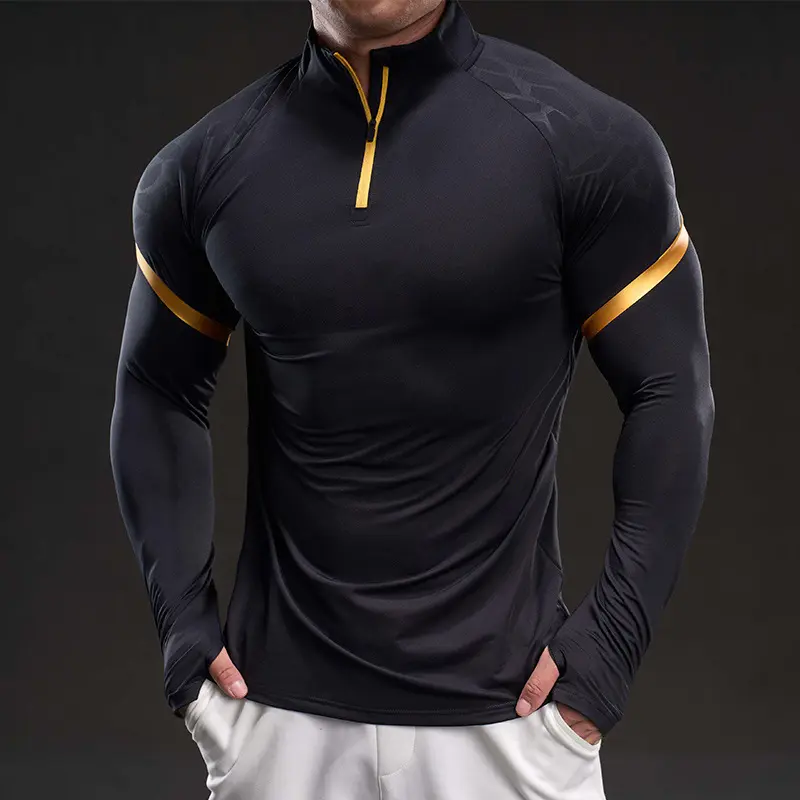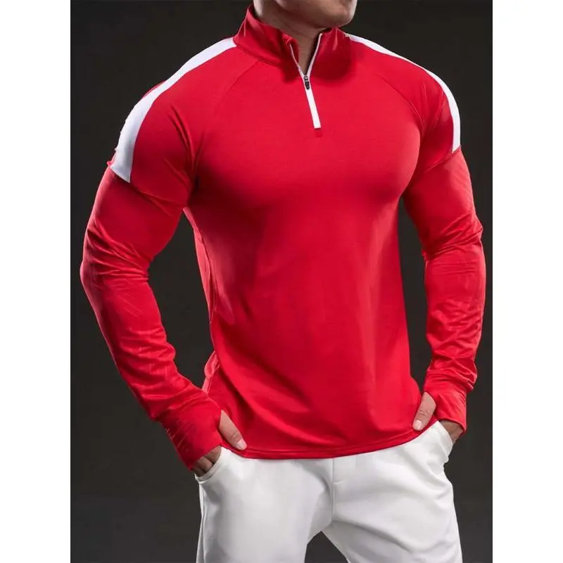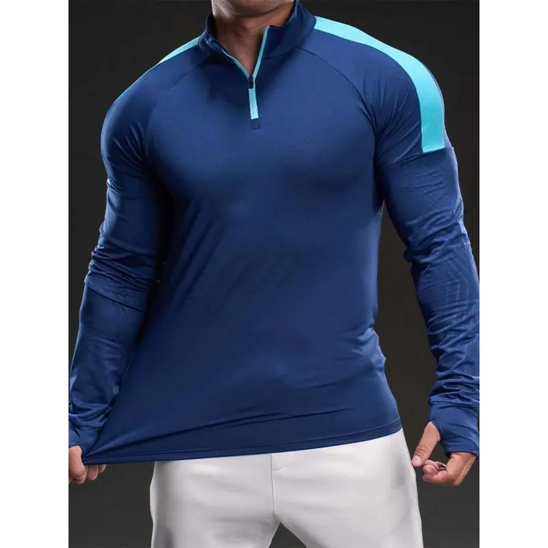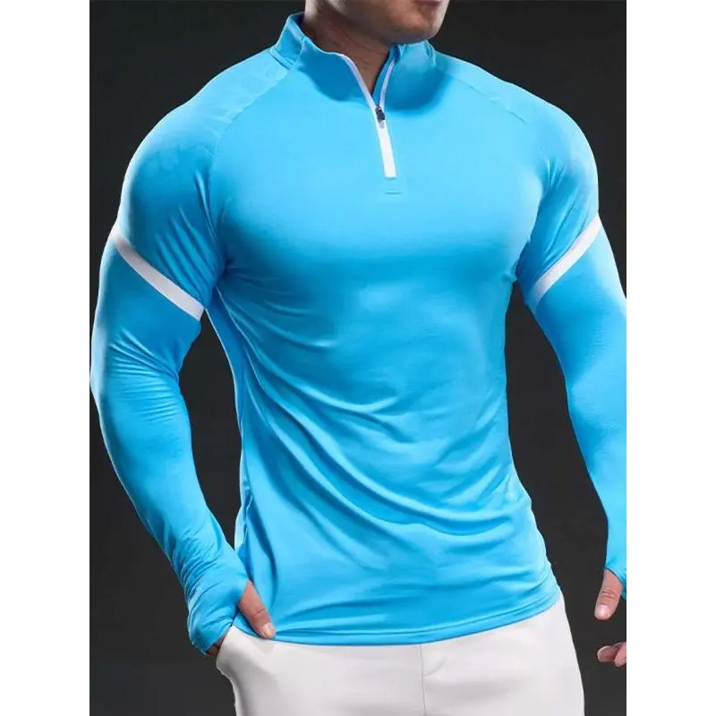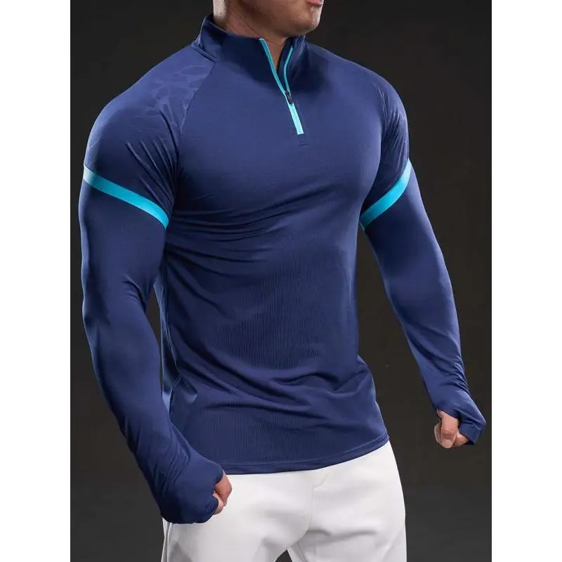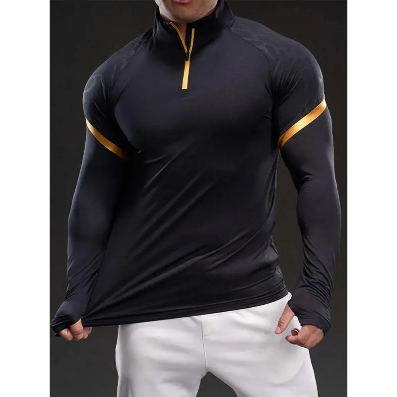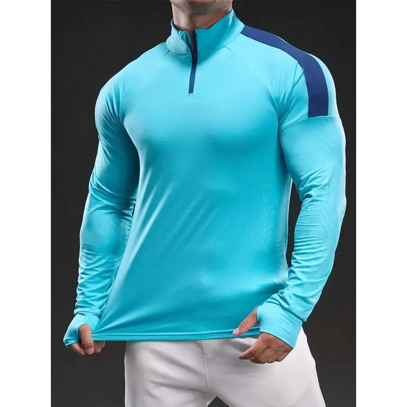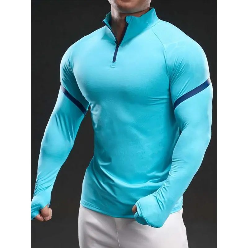 Men's Solid Color Half Zip Up Thumb Hole Long Sleeve Sports Tee, High Stretch Casual Comfortable Breathable Stand Collar T-shirt for Gym Workout Running
