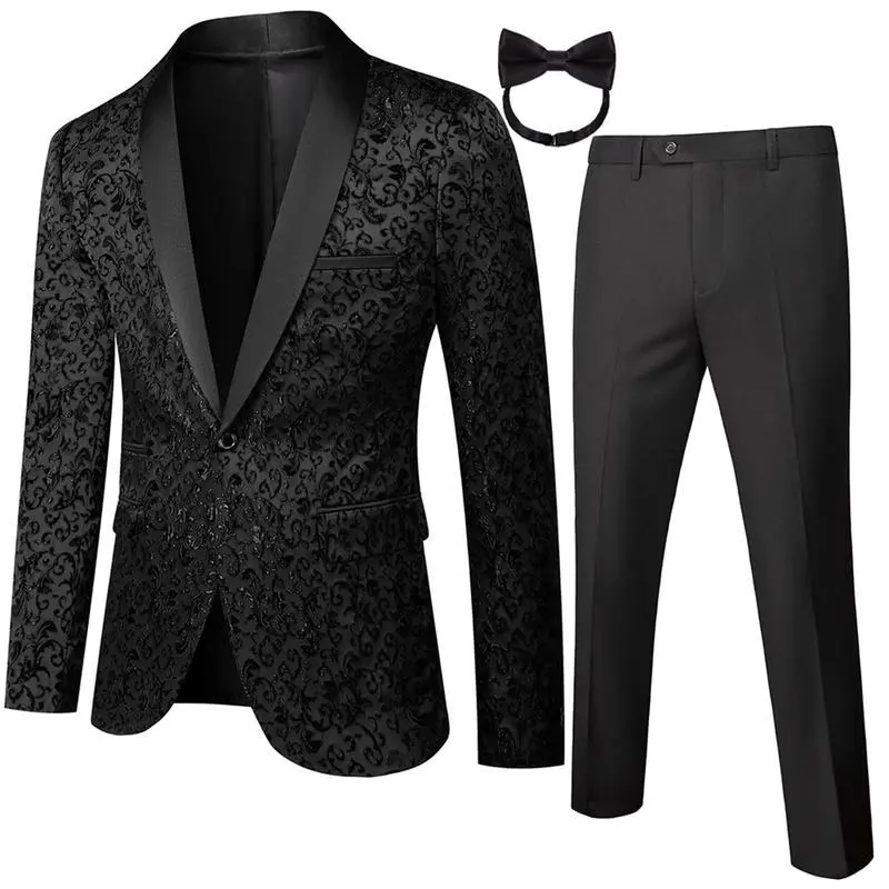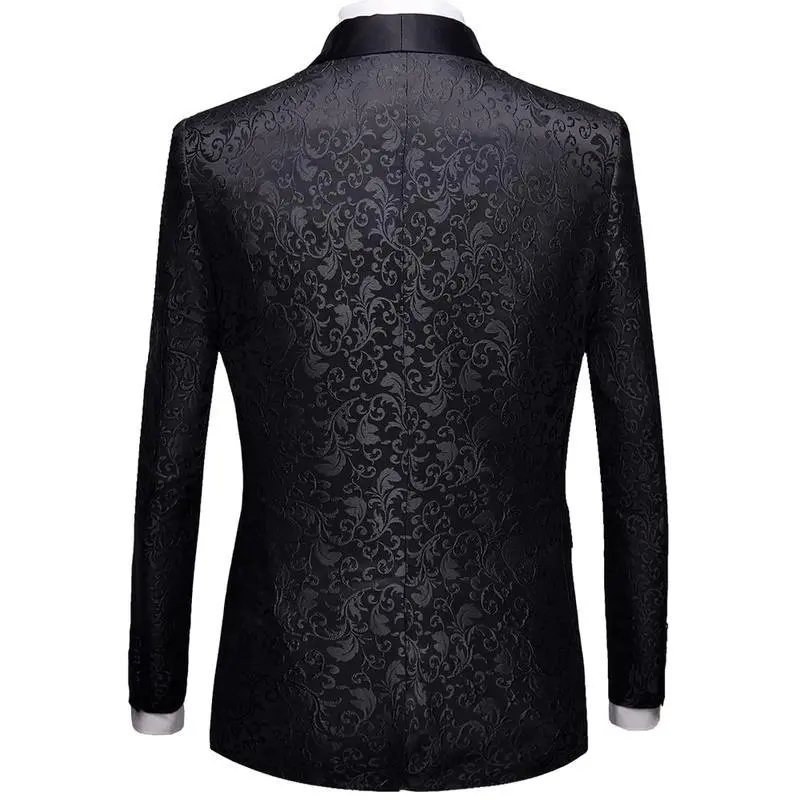 Men's Two-Piece Floral Jacquard Dress Suit Set: Single Button Printed Dinner Jacket and Matching Trousers Black