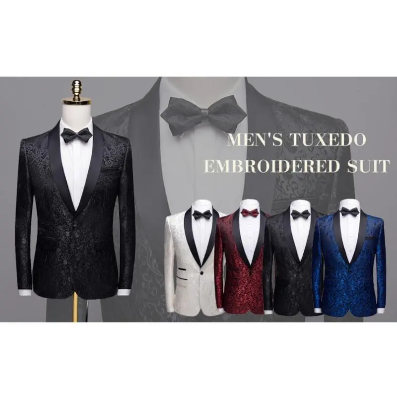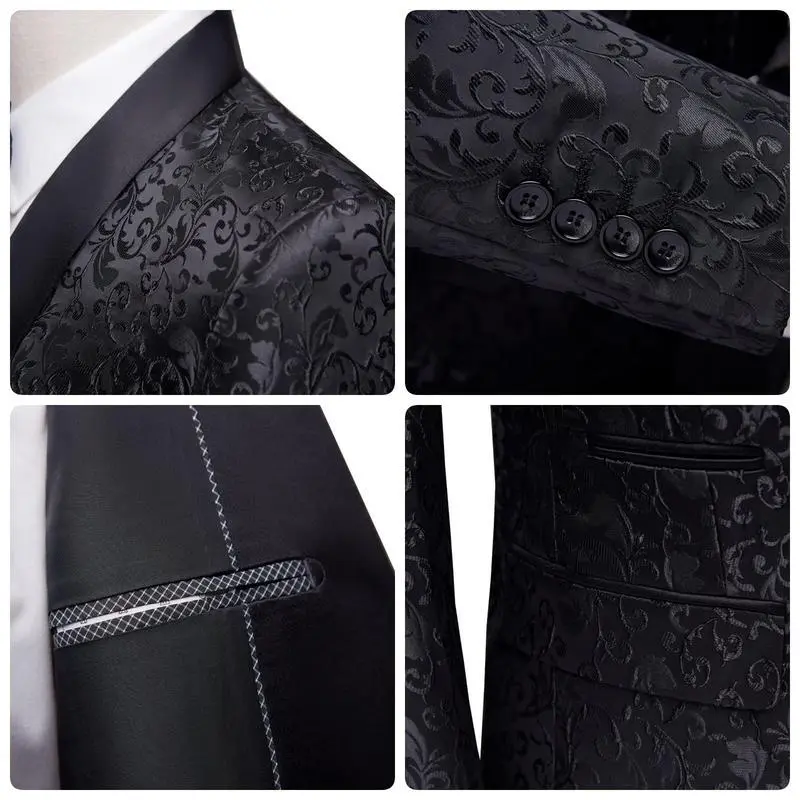 [MATERIAL]: High grade polyester - Skin friendly and breathable when wearing; Premium fabric offers all day comfort [DESIGN]: Top - Elegant suit blazer with black shawl collar, center vent, one chest pocket, two inner pockets and two side flap pockets, featuring exquisite floral print, 3D tailored fit cut and full shoulder design, overall nice expressing a sharp looking; Bottom - Flat front trousers with two side slant pockets and two back pockets [OCCASIONS]: Easy matching and suitable for party, celebration, prom, banquet, show, dancing, homecoming, wedding, festival etc. [WASH CARE]: Regular dry clean; Do not bleach or tumble dry; Warm iron or steam at low set; Hang dry and recommend hang up when not wearing [PACKAGE INCLUDING]: 1*Blazer+1*Pants. Should you have any questions about size, please feel free to contact us. Since our suits sold as complete set, please pack all the original items you received with the return package before send back if come to the return or replacement issue