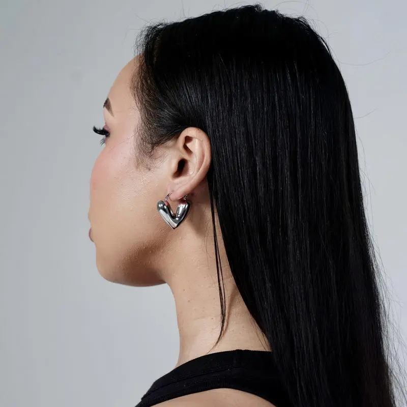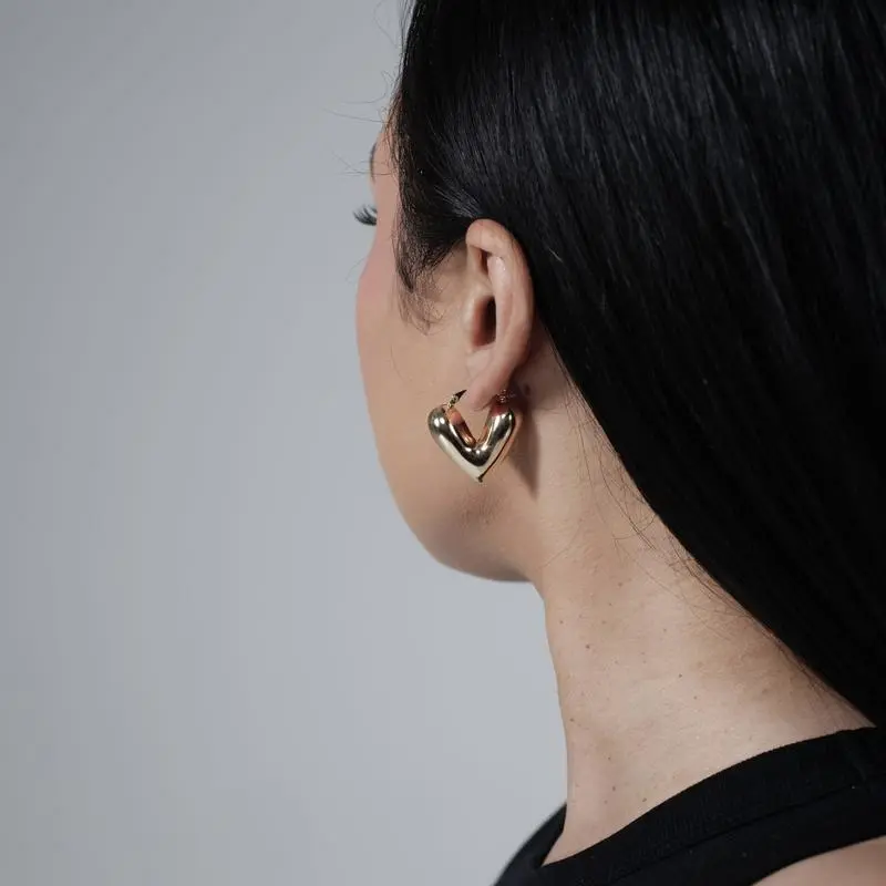 Medium sized puff heart shaped hinge earrings. Comes in bright silver and gold. 18k Gold plated over brass and silver plated over brass. Tarnish and water resistant but treat gently to maintain shine, color and longevity.