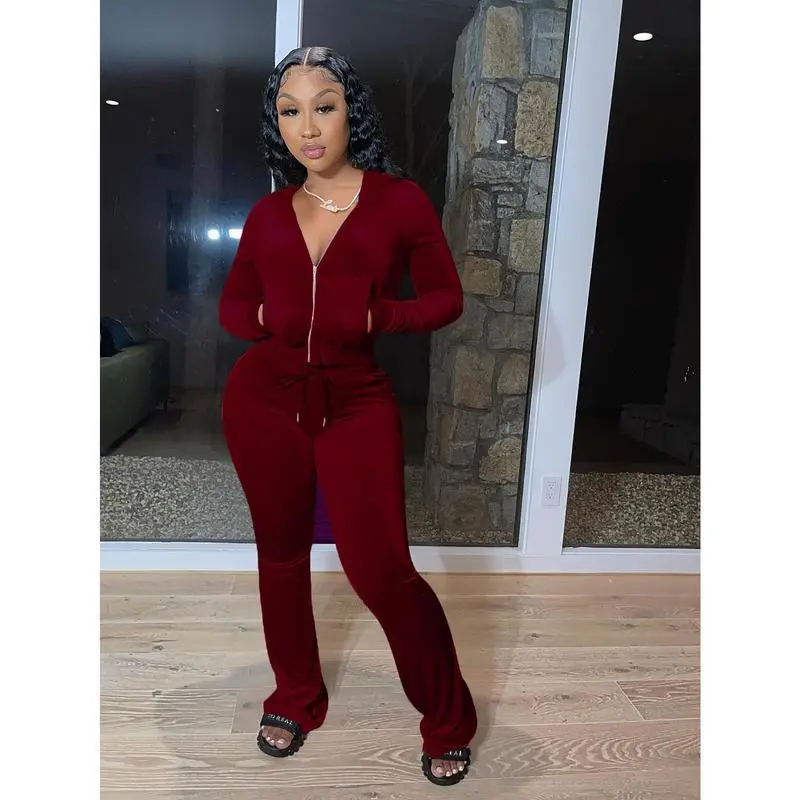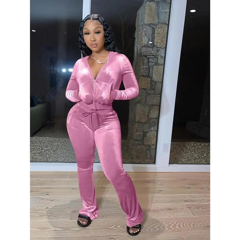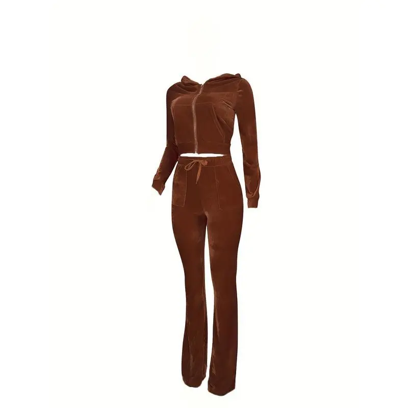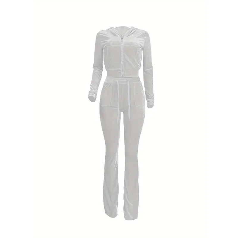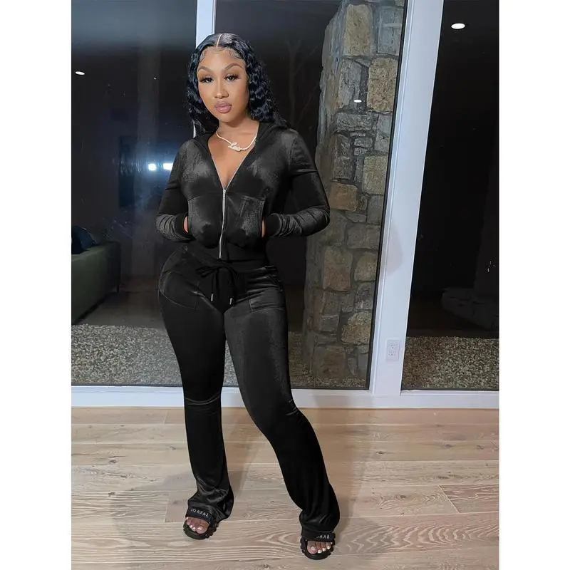 VelvetTwo-PieceSet,ZipUpHoodie&FlareLegPantsOutfitsForSpring&Fall,Women'sClothing