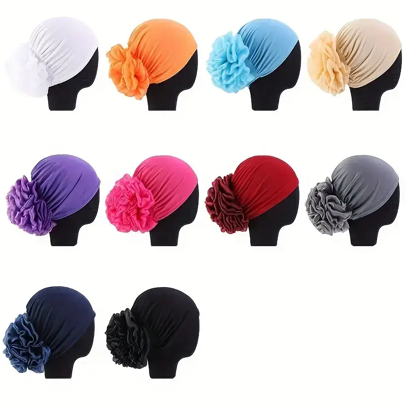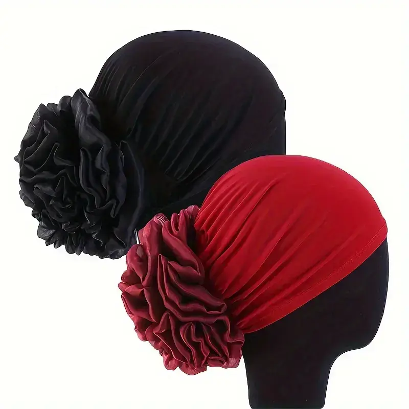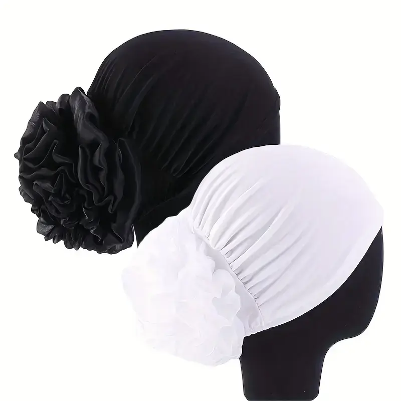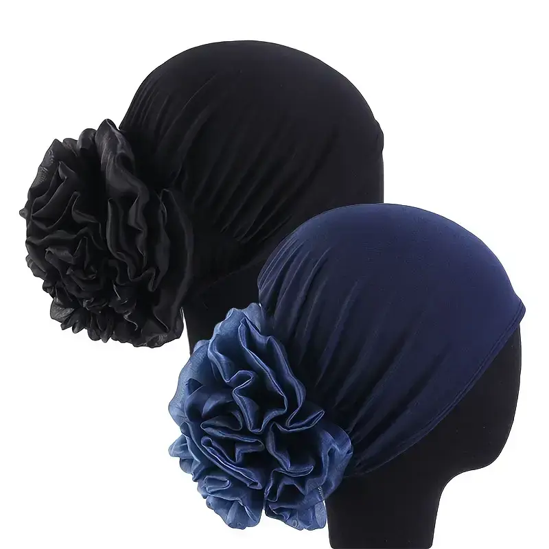 Elegant 2pcs/set Boho Turban Hats - Elastic Beanies with Flower Head Wraps for Women Daily Use Ramadan Chemo Cap