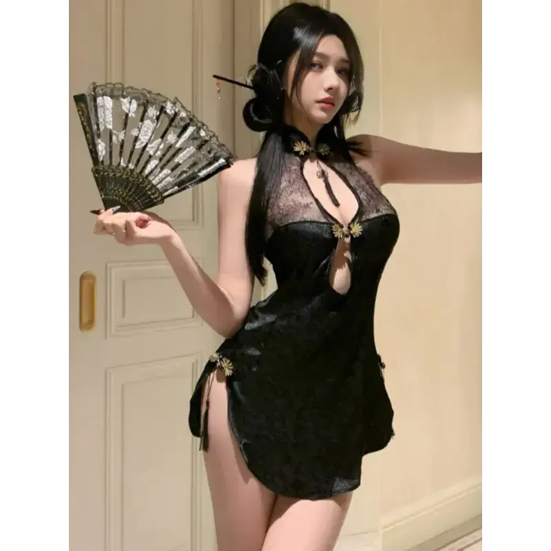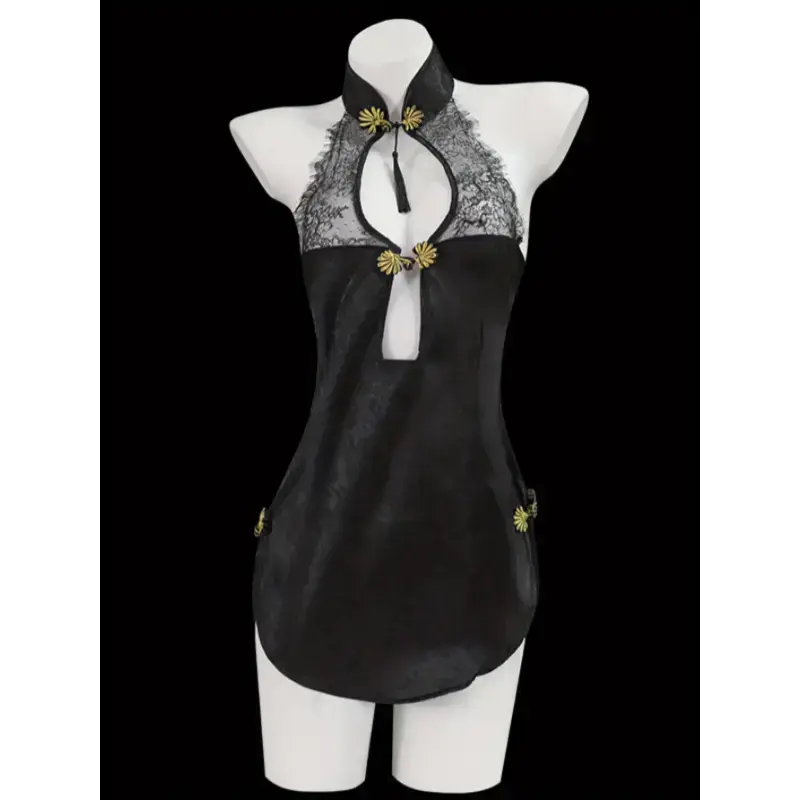 Elegant Chinese-Inspired Cheongsam Lingerie Set for Women - Vintage Style, Polyester, Includes Dress & Thong with Lace Detailing, Perfect for Date Night or Home Sleepwear Party Fabric Black Womenswear
