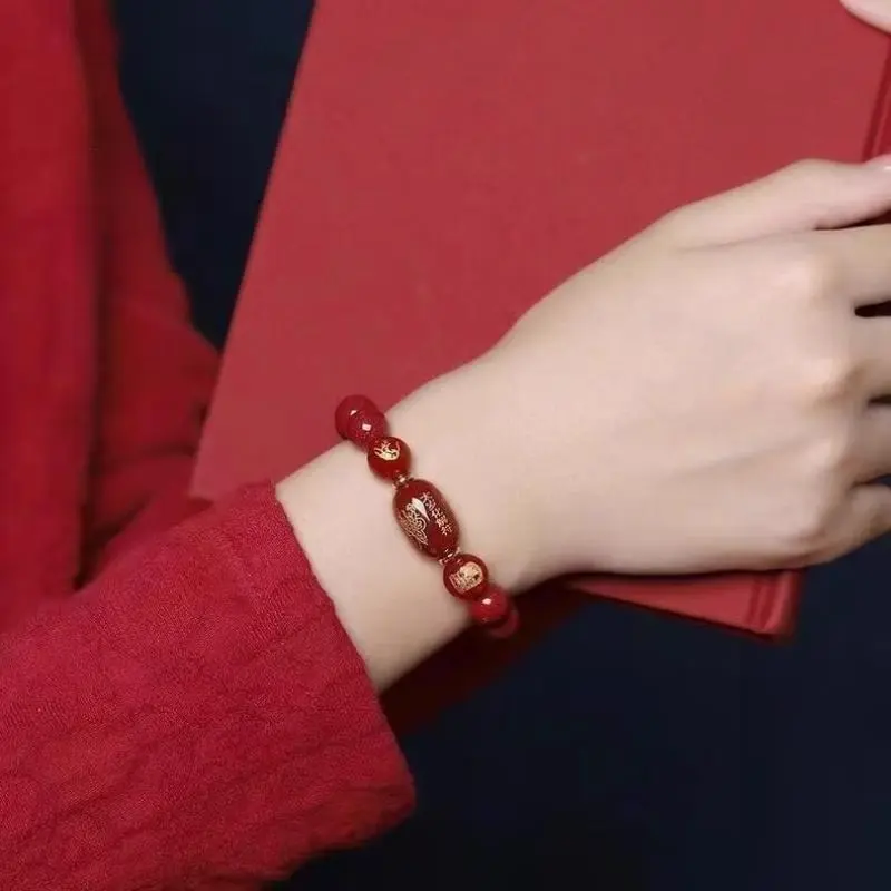 1pc Zodiac Bracelet - Authentic Cinnabar Beads with Golden-Accented Rabbit, Mouse, Dragon, Horse, Rooster Charms - Traditional Chinese Style, Perfect for Casual Attire & Gifting