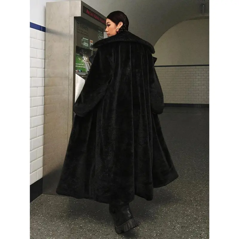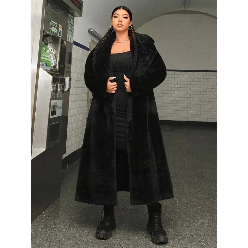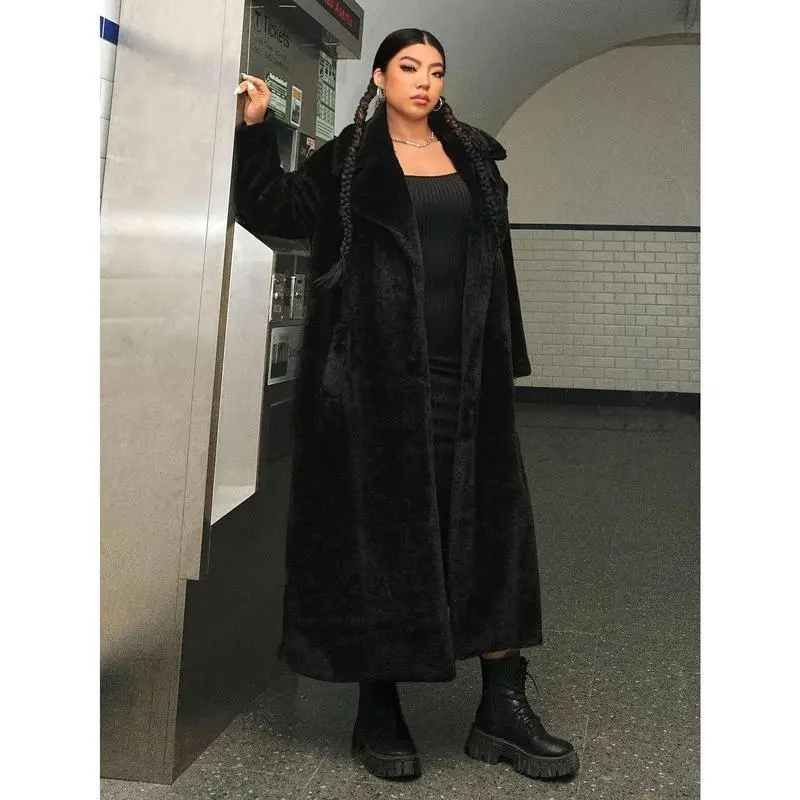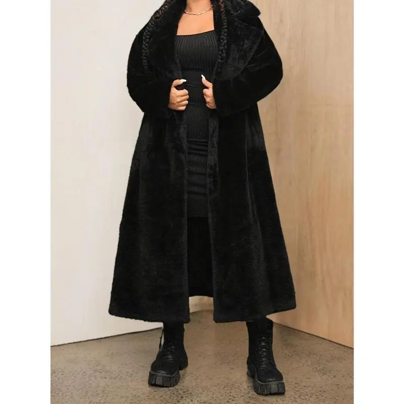 Plus Size Faux Fur Coat - Soft, Elegant Lapel Collar, Long Sleeve, Longline Design, Warm and Cozy for Fall and Winter - Tops Polyester Womenswear