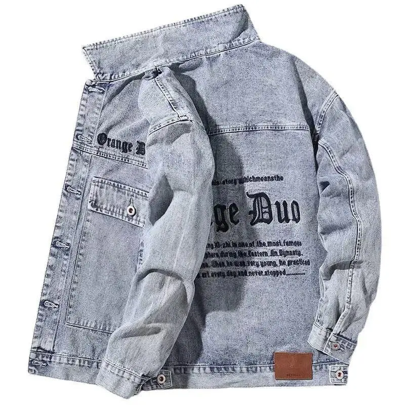 Men's Denim Jacket Wide Shoulders Male Jean Coats with Embroidery Blue Letter Trendy Menswear Fast Delvery Outwear Korea Casual Quality fabric Comfortable Fathersdaygift Tops