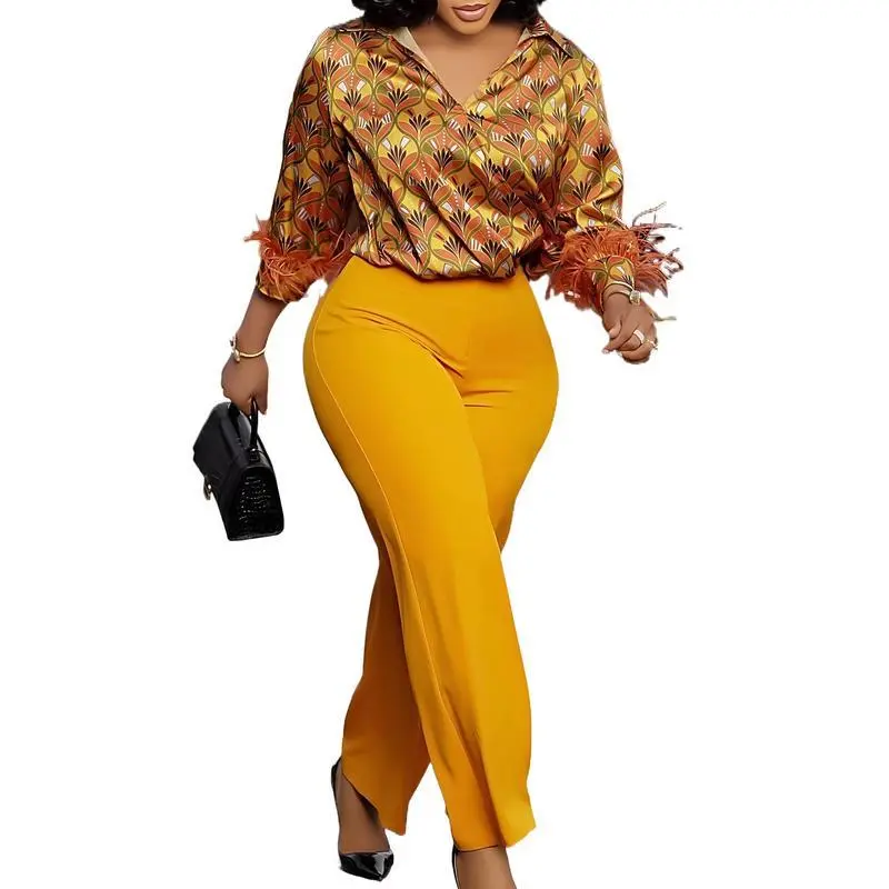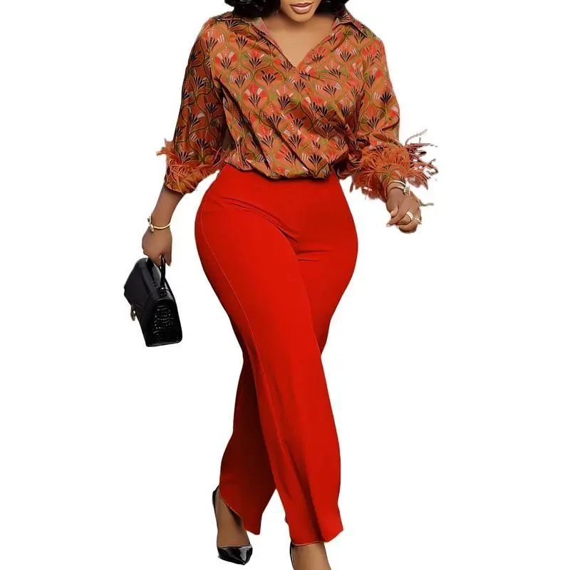 Redlacefabricformalwomen'sprintedlongsleevedshirtandwidelegpantssuitwithelegantandfashionableAfricanstyleforformaloccasions