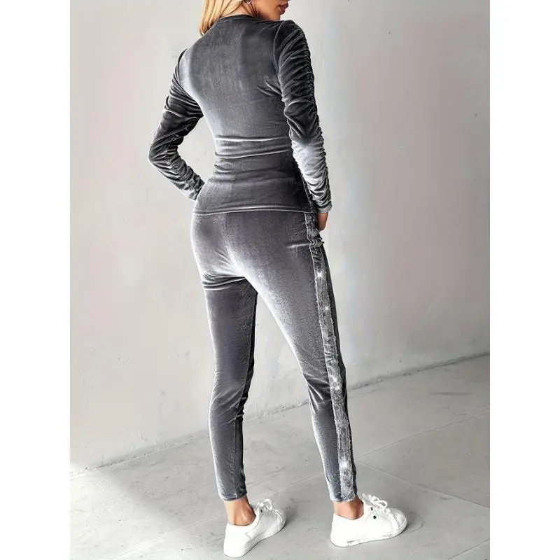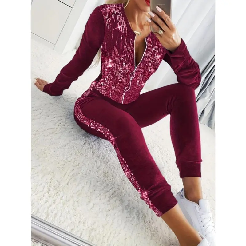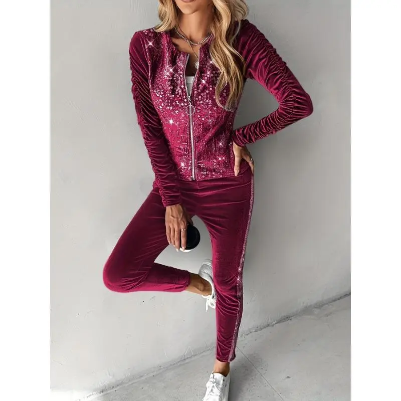 Women'S Sequin-stitched Velour Coat + Pants Two-piece Suit