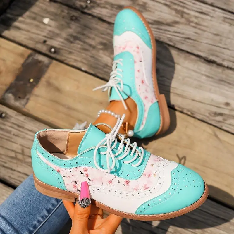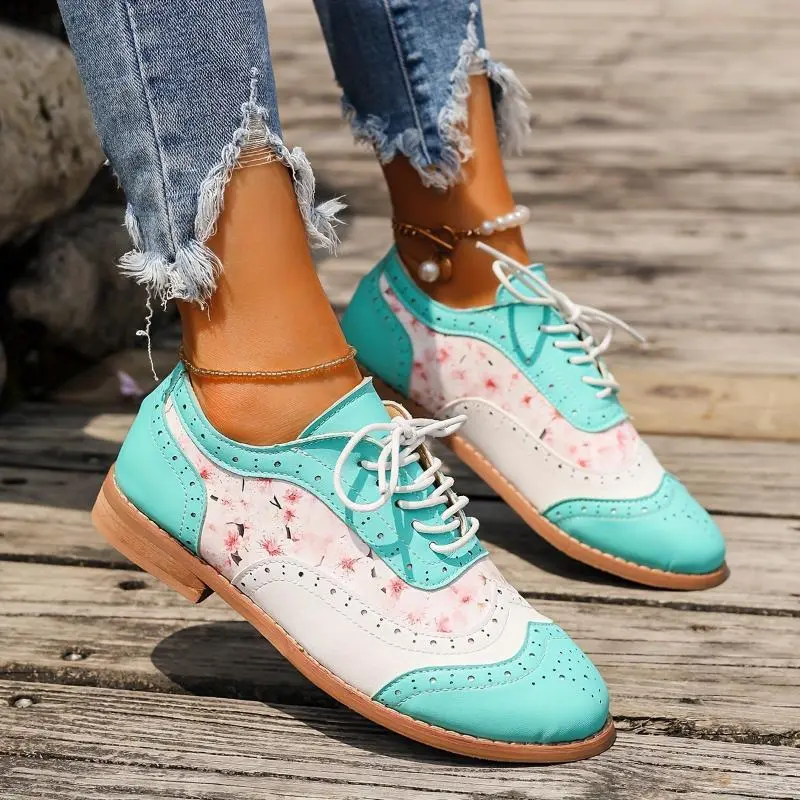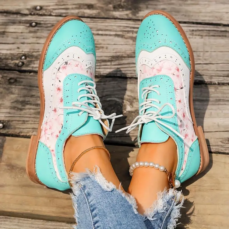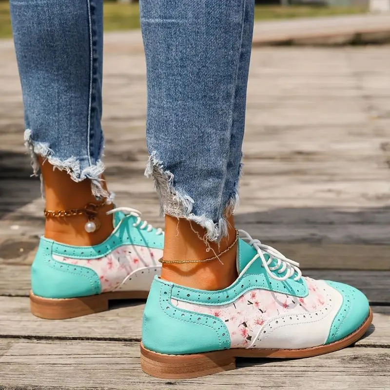 Women's Contrast Color Brogue Oxfords - Floral Print Lace Up Flat Shoes - Perforated Round Toe - Fashionable & Comfortable - For Women - Suitable for Casual & Formal Occasions - Perfect Gift for Fashionistas Footwear Girl