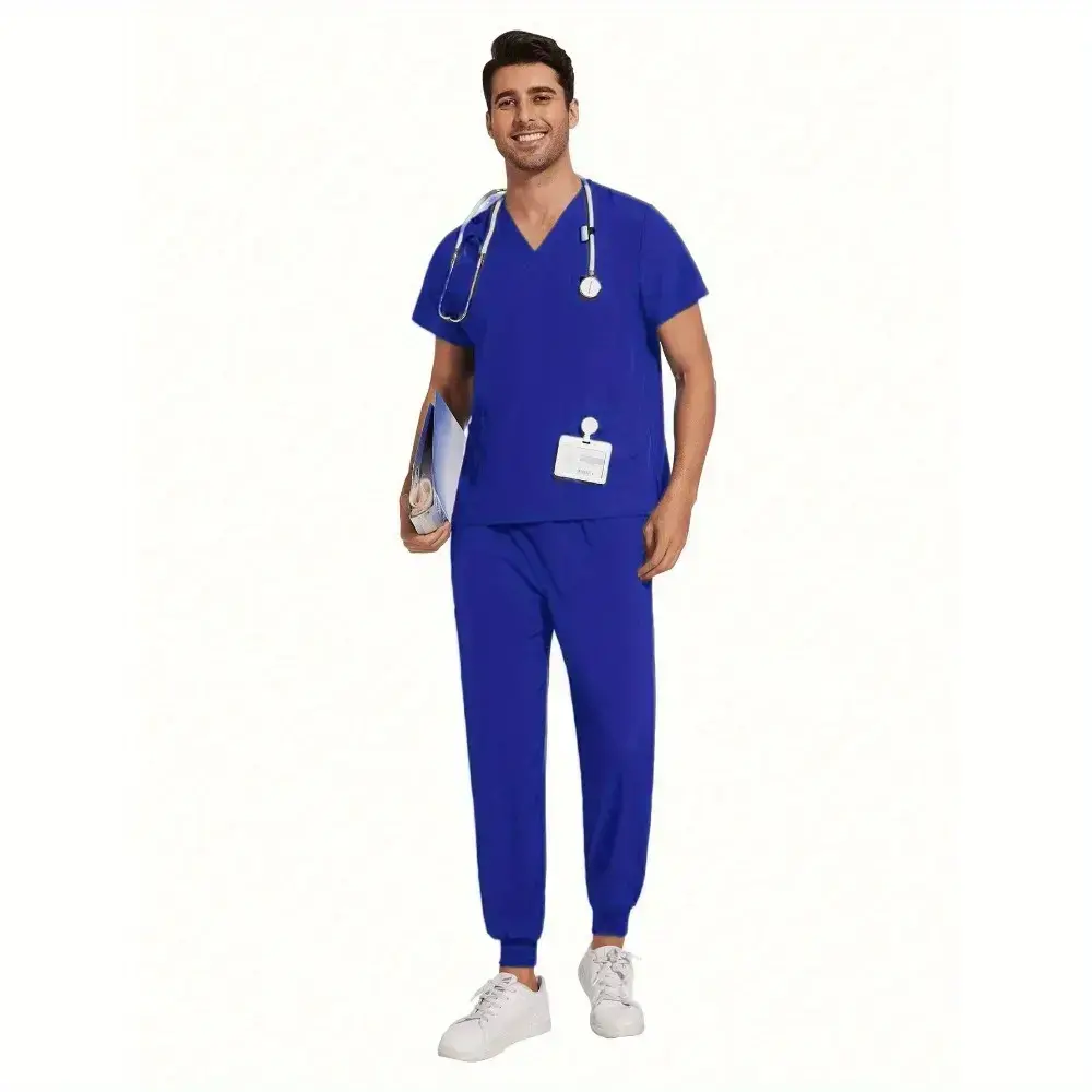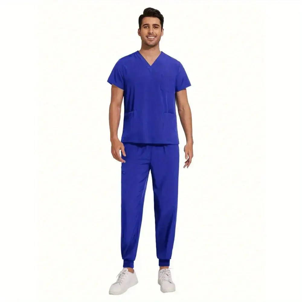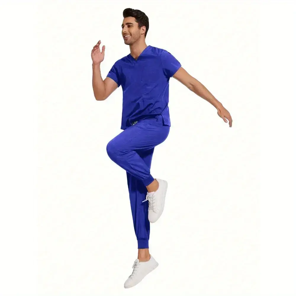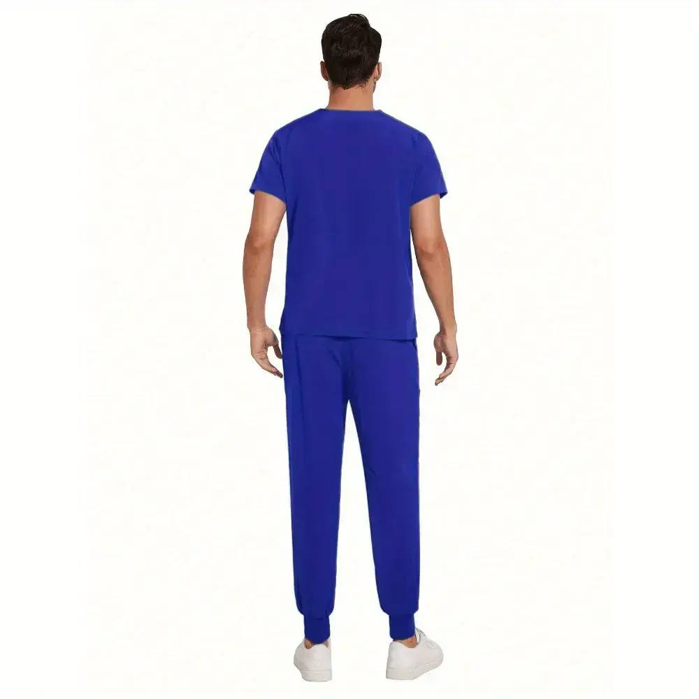 Stylish 2Pcs Scrubs Set for Men Nursing Pet Care Dental Work Uniforms Stretchy Jersey Fabric Contrast Stitching Modern Slim Fit