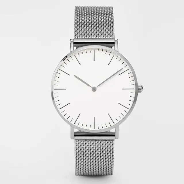 Silver shell, white face, silver strip (