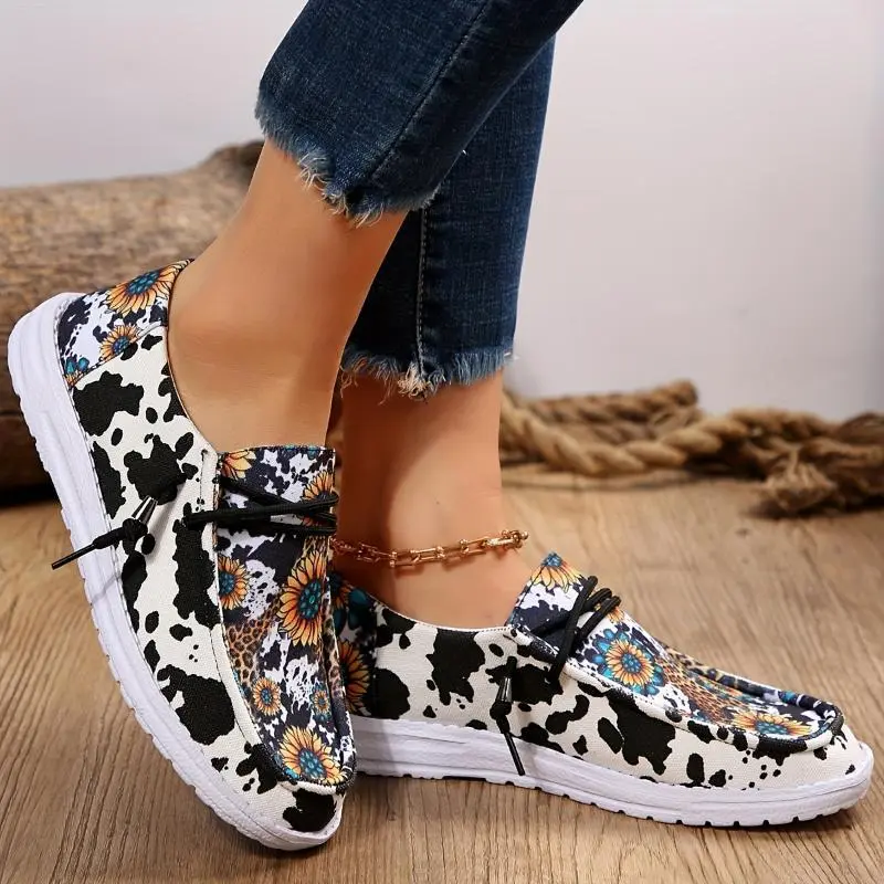[Comfortable Flat Shoes] Lightweight Comfortable Women's Cow Pattern Flat Shoes, 36-45 Large Size, Four Seasons Party Daily With Adjustable Laces, Casual Sports Shoes
