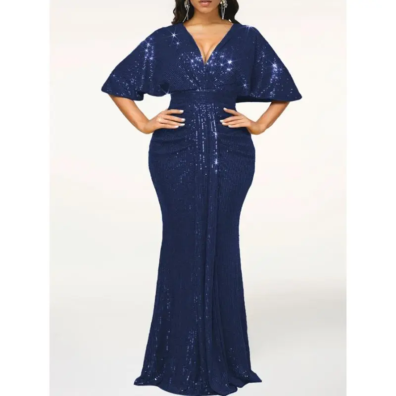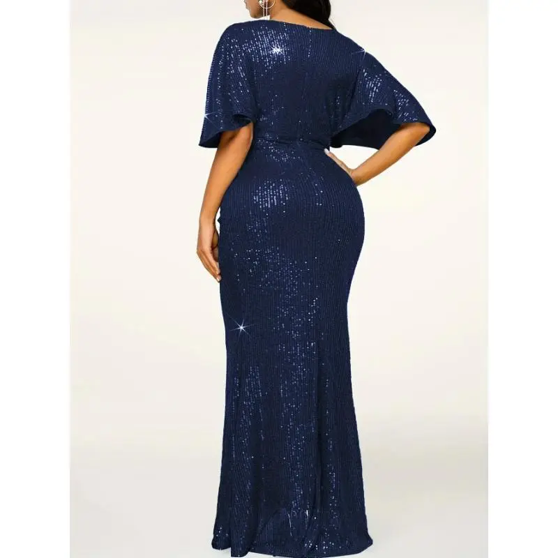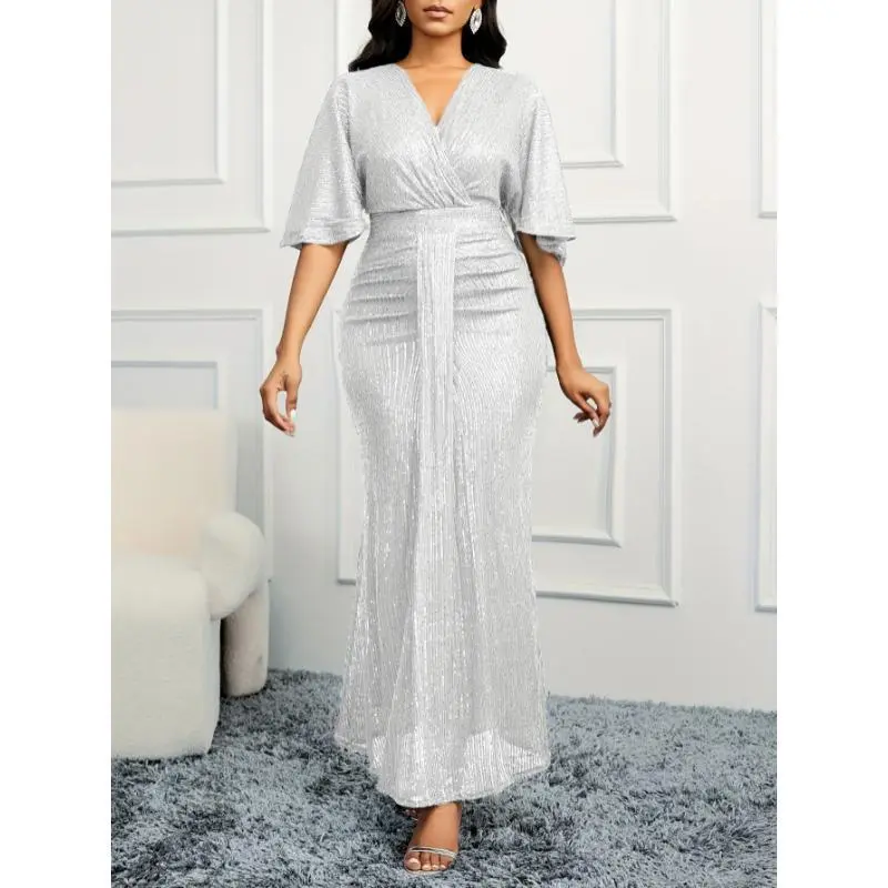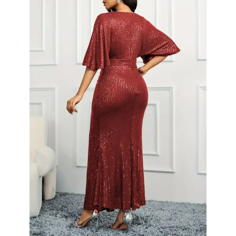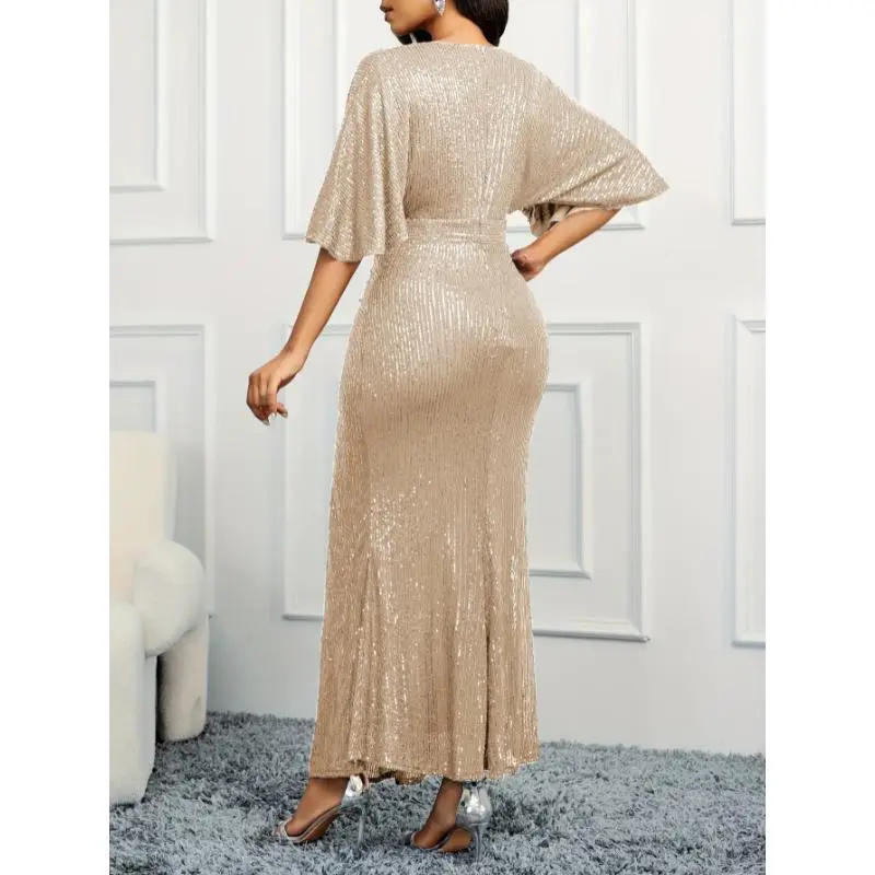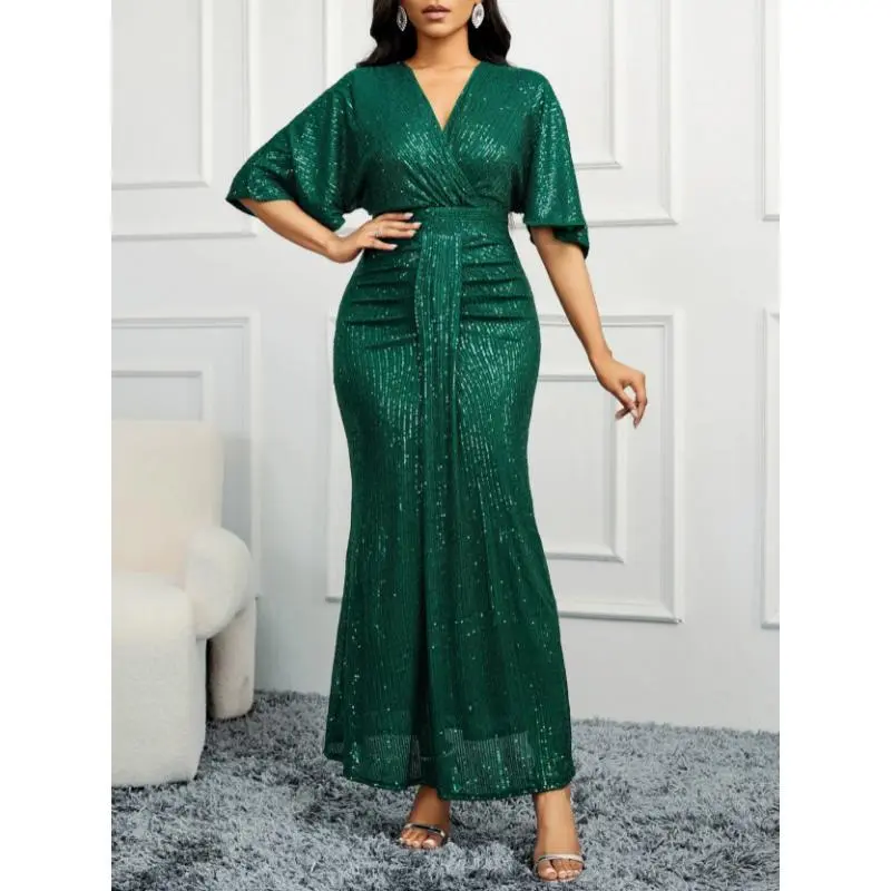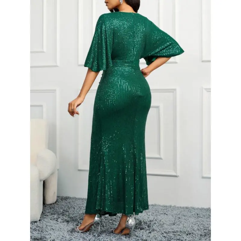 Sequin Surplice Neck Cocktail Dress, Elegant Ruffle Sleeve Mermaid Hem Dress For Party & Banquet, Women's Clothing Wedding/Evening dress/Occasion/Engagement/Ceremony Fabric Formal Womenswear Dark Green Workwear Polyester Vneck