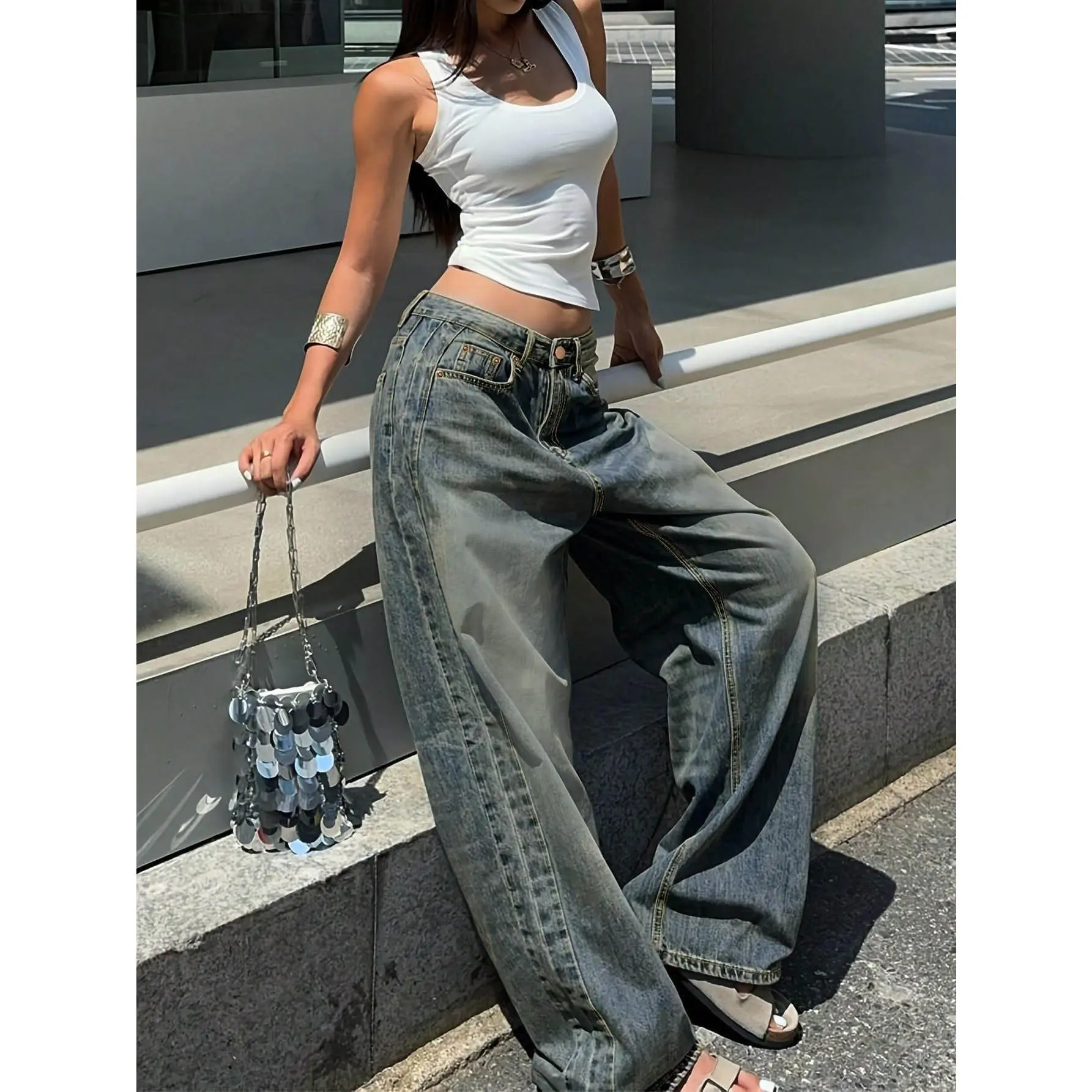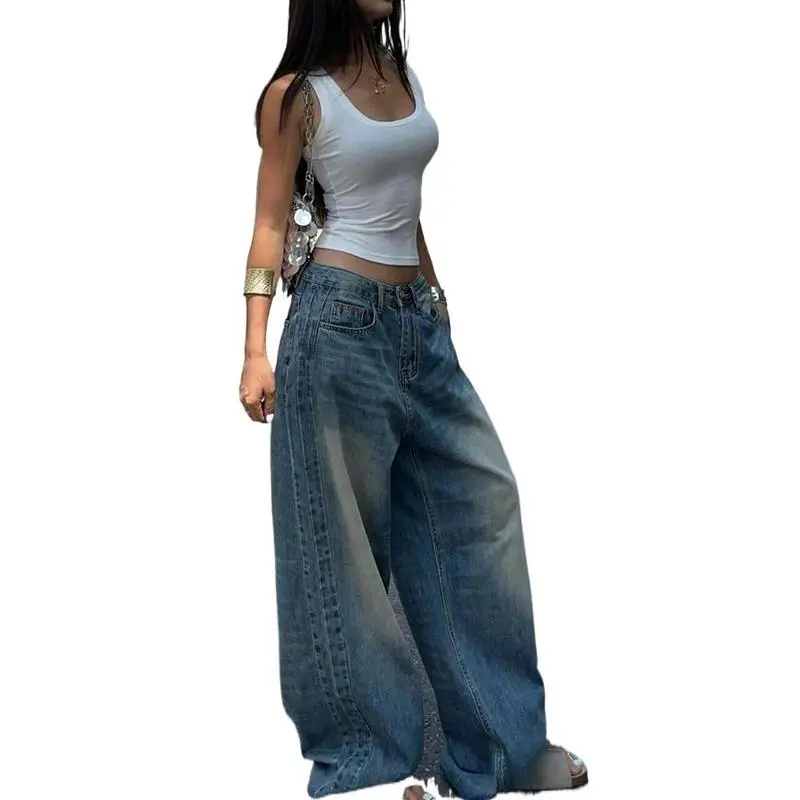 Vintage Blue Washed Straight-Leg Jeans For Women, American Design Loose Casual Wide-Leg Dragging Long Pants Denim Fit Womenswear Bottom