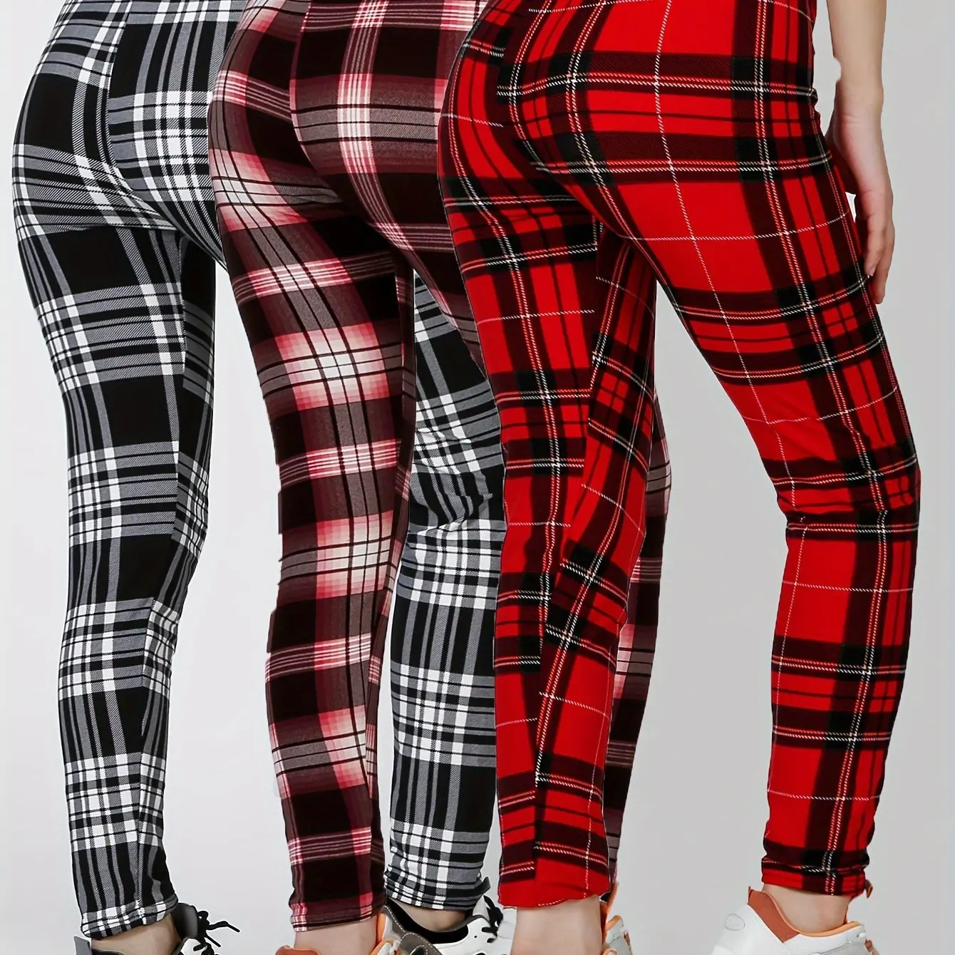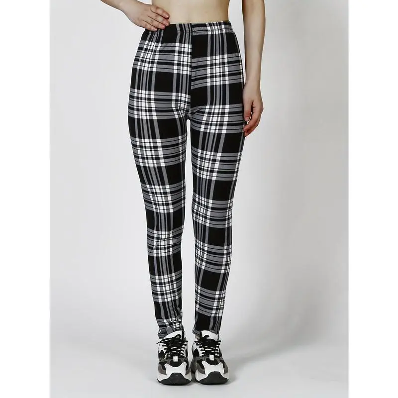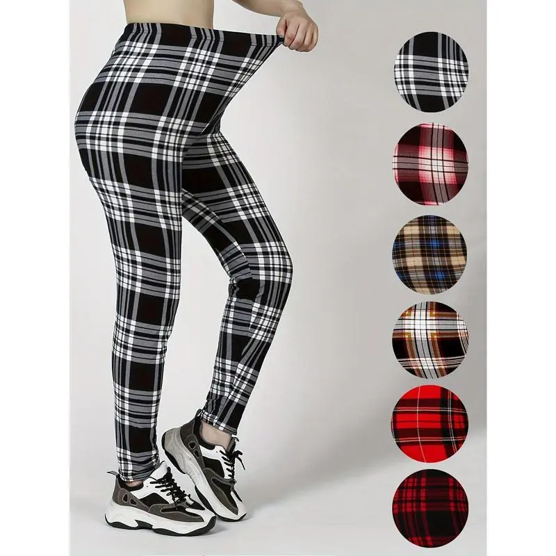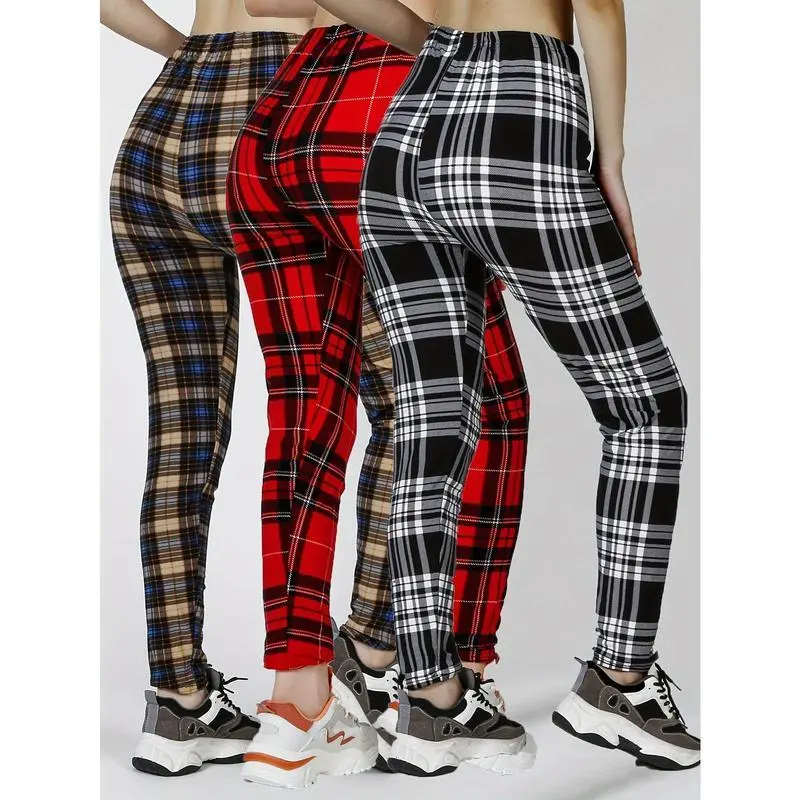3 Pieces Plaid Pattern High Waist Workout Leggings, Casual Skinny Stretch Leggings, Suitable for Daily, Women's Clothing