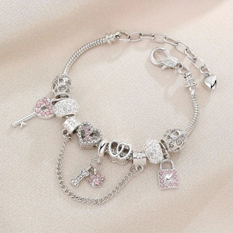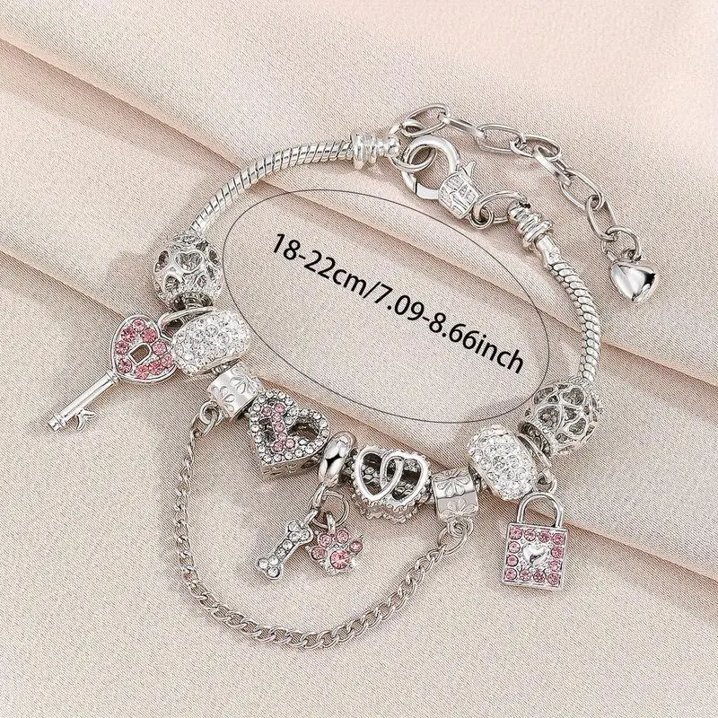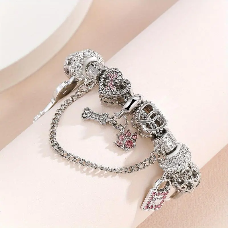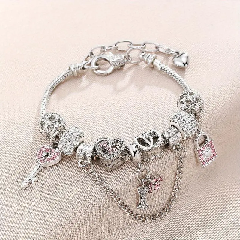 Multi-Color Rhinestone Charm Chic Bracelet - Hollow Bone & Claw Print, Heart Lock Pendant, DIY Snake Chain Design for Women - Perfect for Daily Wear & Vacations