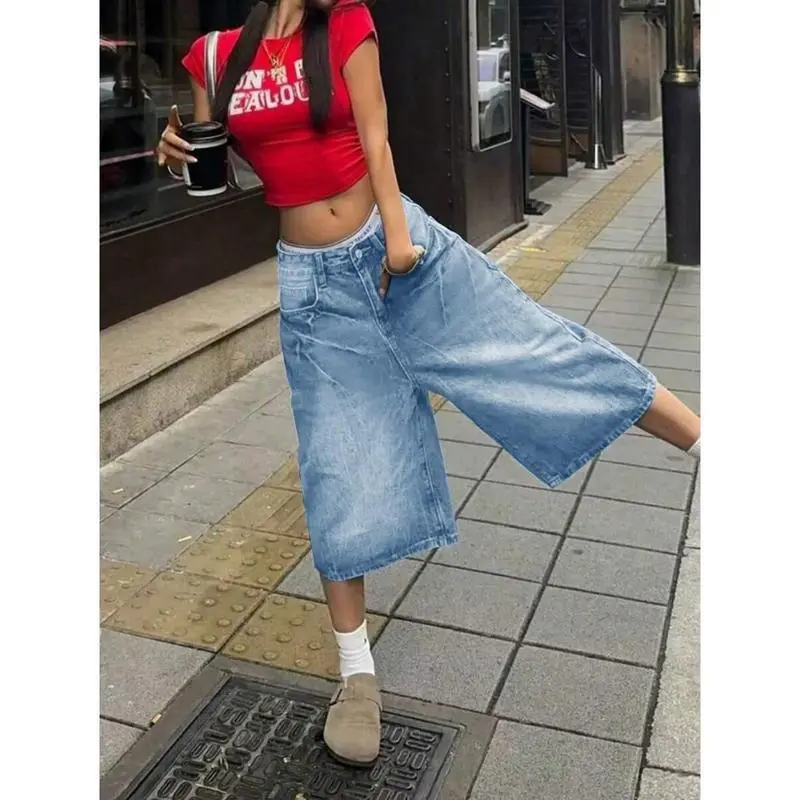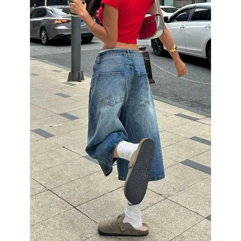 Y2KStreetVintageWashedCatWhiskeredPocketStyleWideLegBermudaJeansDenimJortsCasualShortsCroppedTrousersFitWomenswearBottomPolyesterZipperFlyBlueNon-StretchDenimPrintFloraljean