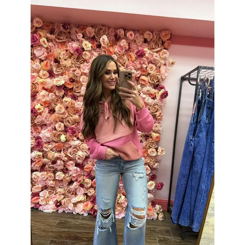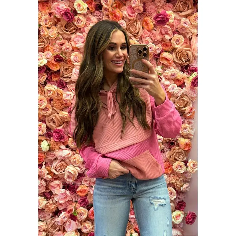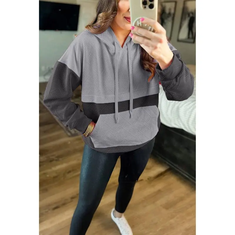 Textured Color Block Kangaroo Pocket Drop Shoulder Hoodie
