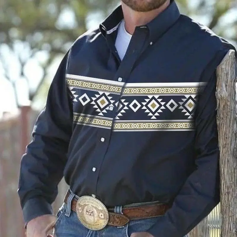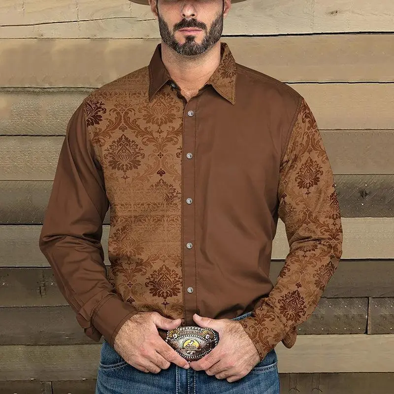 Western Cowboy Style Printed Shirt for Men with Double Chest Pockets, Trendy Vintage Youth Streetwear Menswear Top