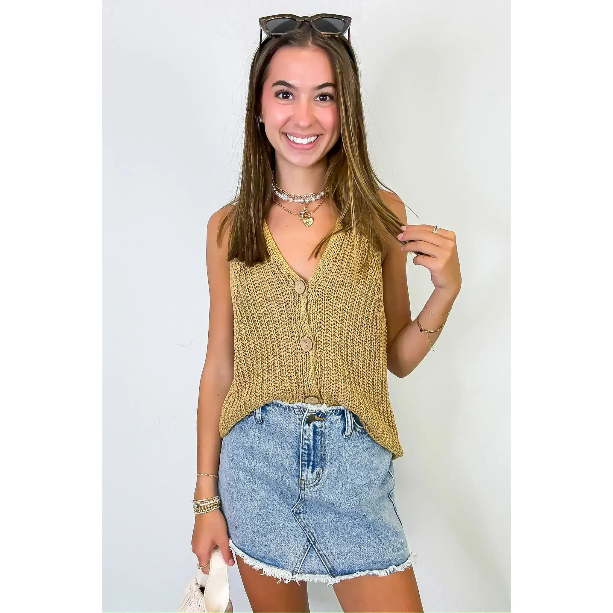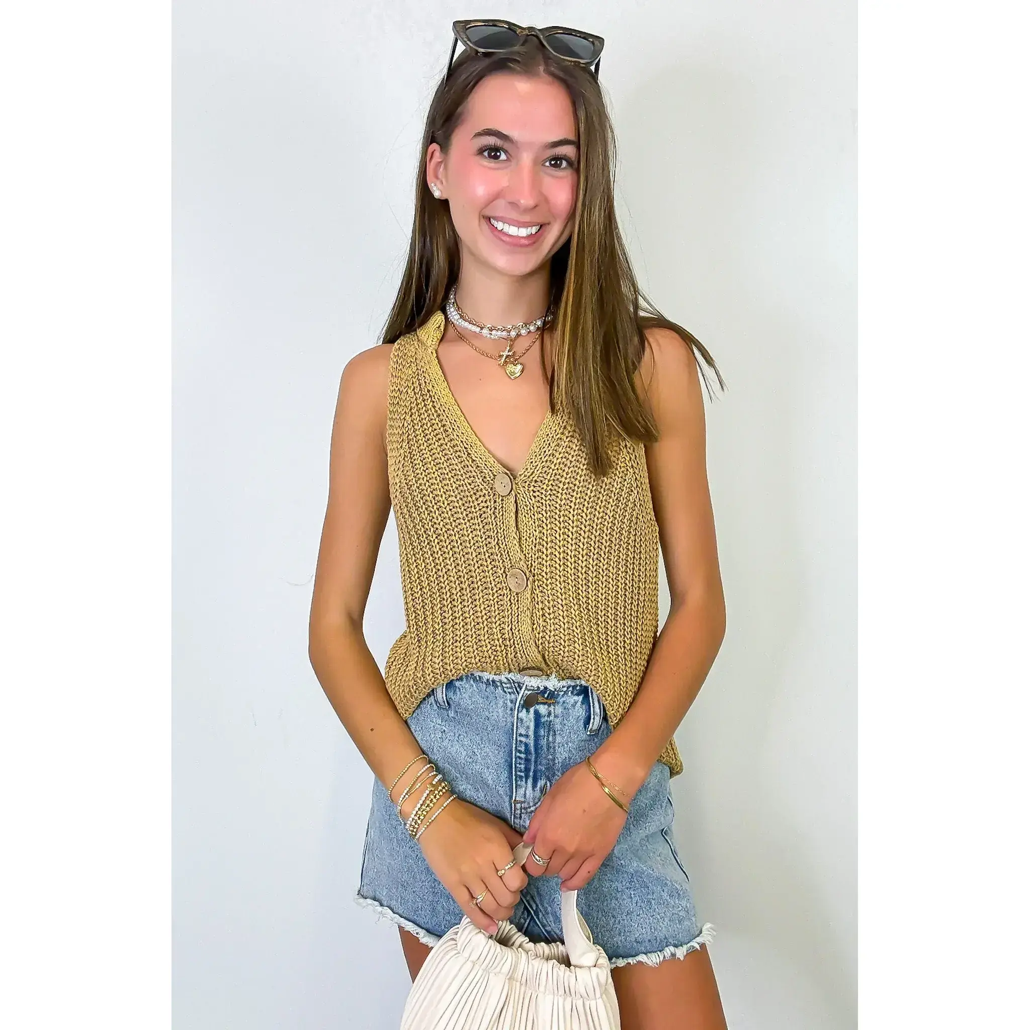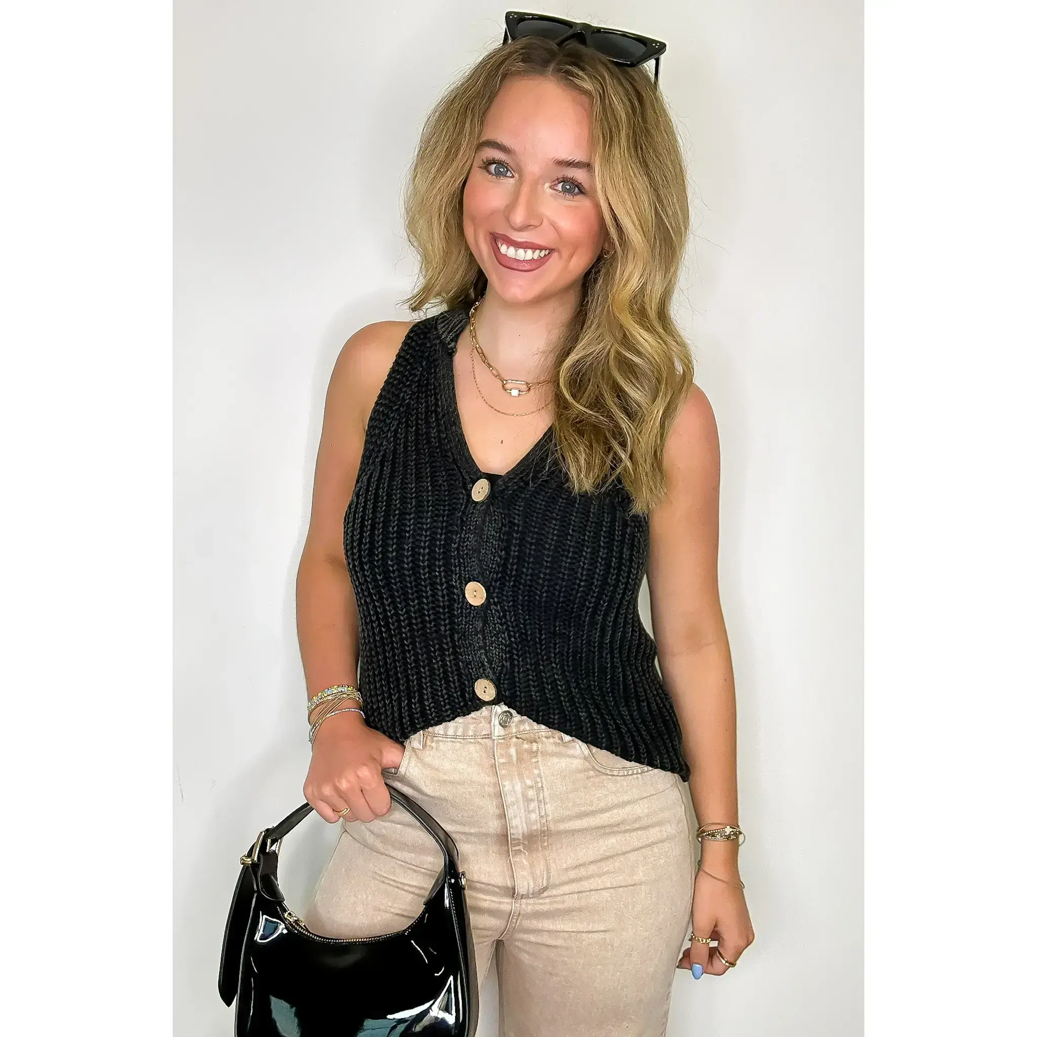 Details: Elevate your layering game with the Minimalist Knit Vest — a modern essential designed for clean lines and effortless style. Featuring a streamlined button-front closure and a soft, lightweight knit, this vest is the perfect piece to add subtle edge and texture to any outfit. Wear it over a crisp shirt, a fitted tee, or under a blazer for a polished yet laid-back look. - Button front Content: 100% cotton Size + Fit: Model is 5'6" (washed taupe), 5'5" (washed black) and wearing a Small