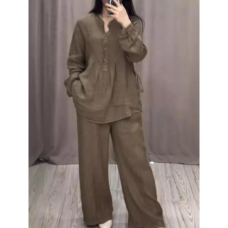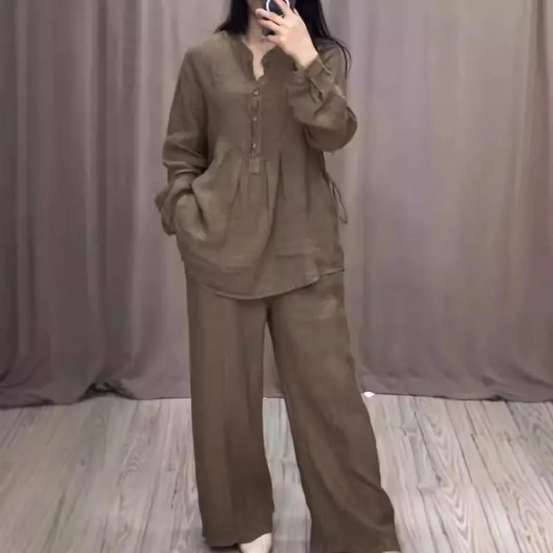 Fashionable and Comfortable Cotton and Linen Long-sleeved Half-open Casual Pleated Wide-leg Pants Suit Clothing Elegant Solid Womenswear