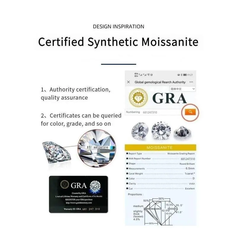 Material: S925 Sterling Silver Type: Certified high grade synthetic moissanite. It's color grade is D, clarity grade is VVS1, cut grade is E, Superflash synthetic moissanite. Special note: The specification of 0.5 carat and above is equipped with certificate, the specification of below 0.5 carat is not equipped with certificate
